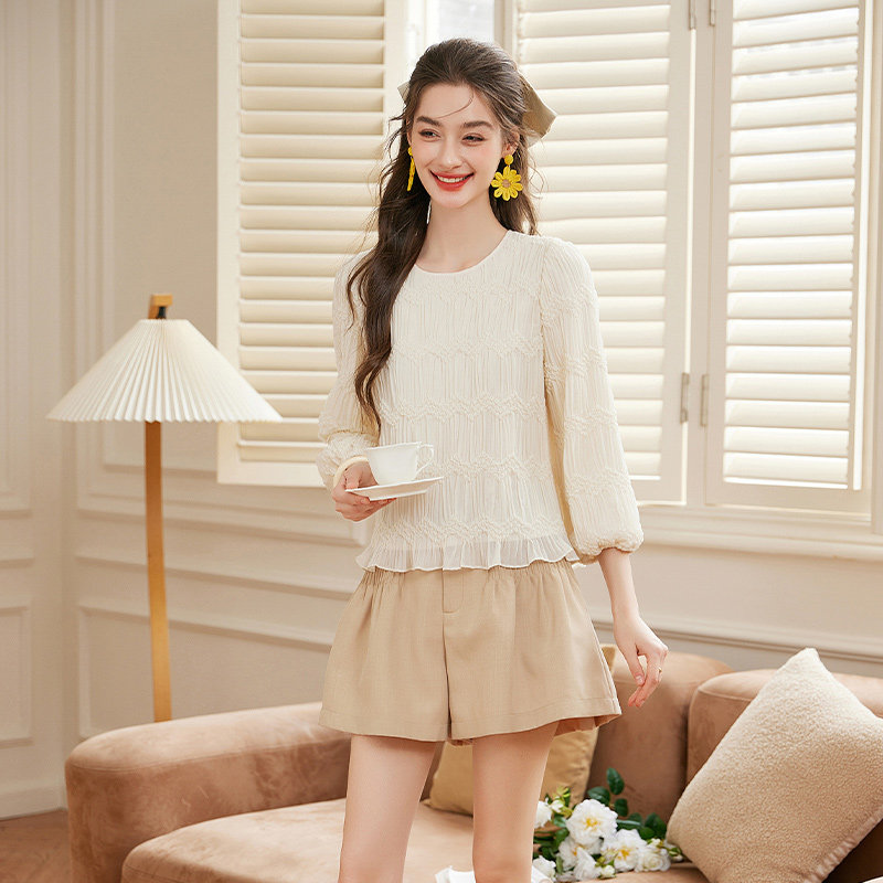 白鹿语褶皱肌理设计感纯色荷叶边衬衣25春新款气质套头圆领衬衫
