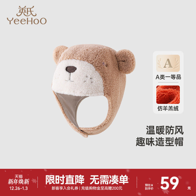 英氏儿童帽子秋冬季加绒保暖防寒婴儿帽宝宝可爱纯棉护耳帽子冬季