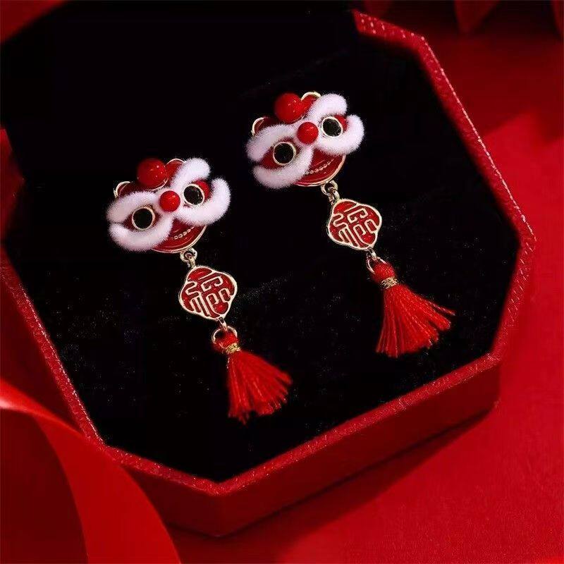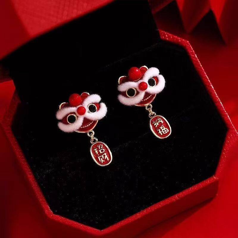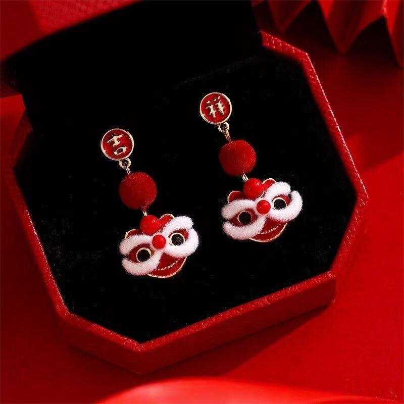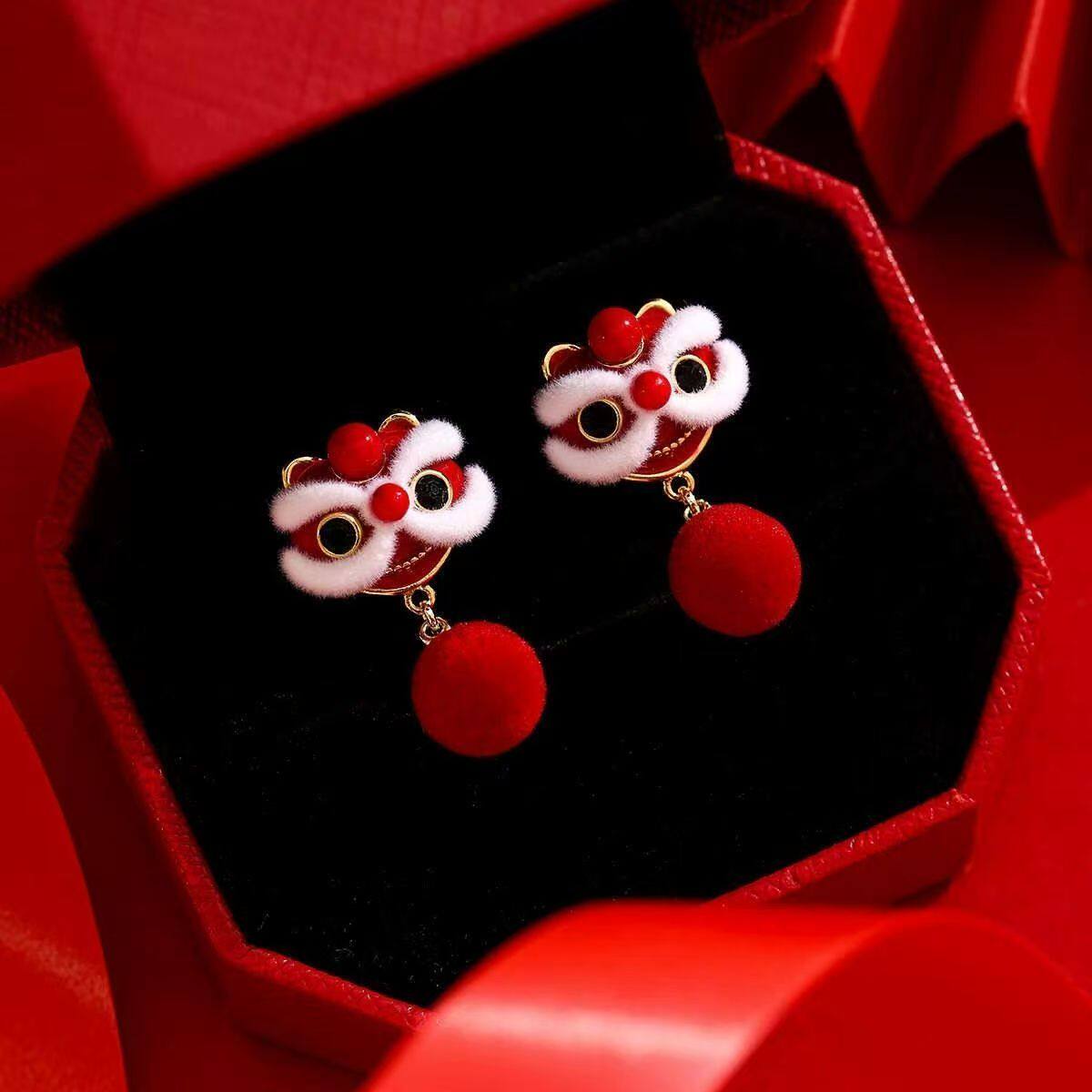 红色毛绒醒狮耳环新中式国风适合过年戴的耳饰女新年喜庆丝绒耳钉