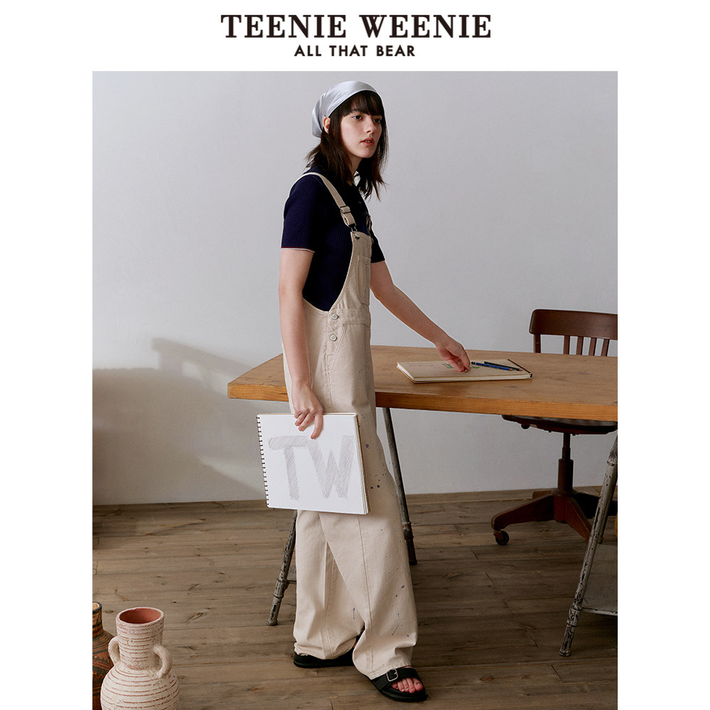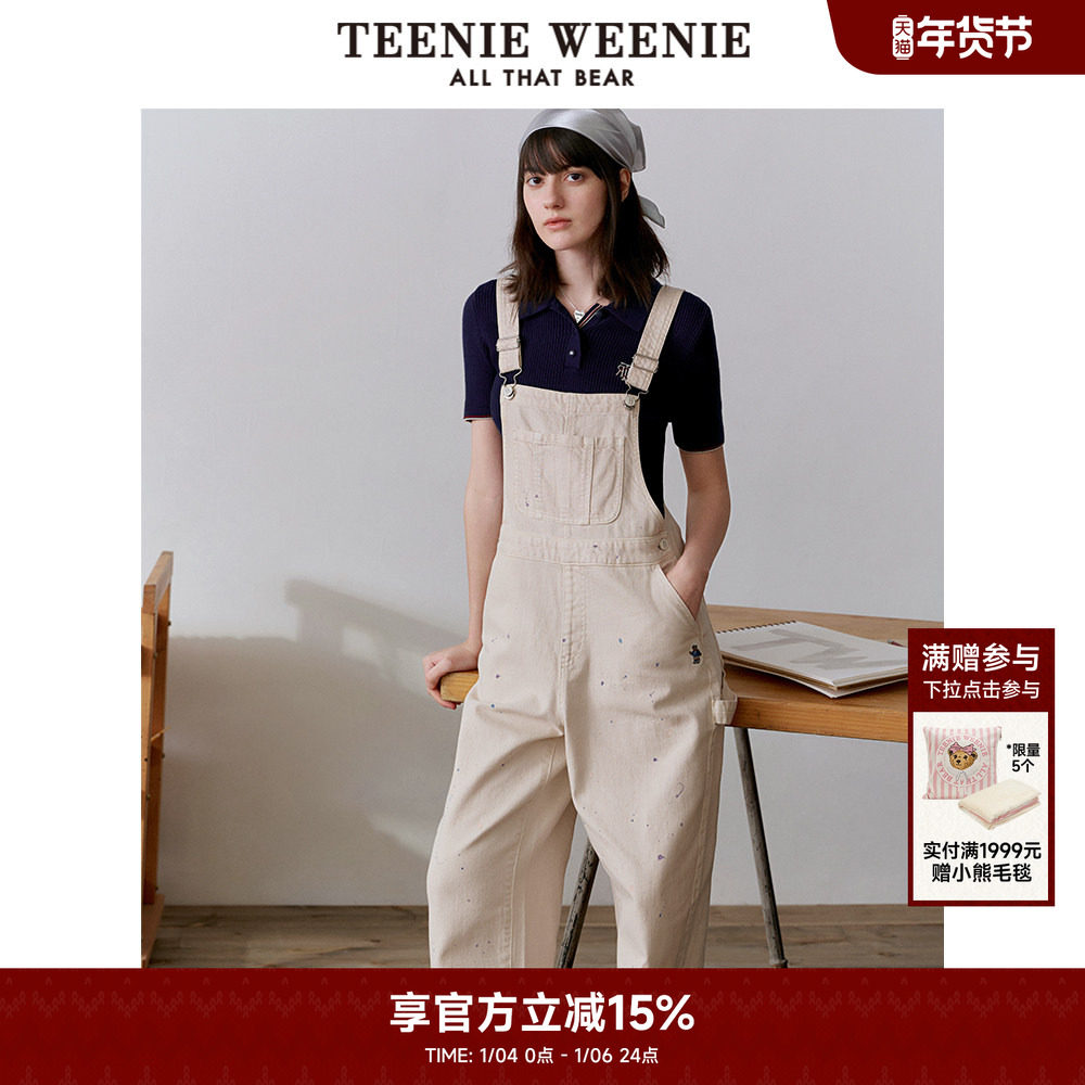 TeenieWeenie小熊奥莱秋季美式复古元气甜酷风白色牛仔背带裤长裤