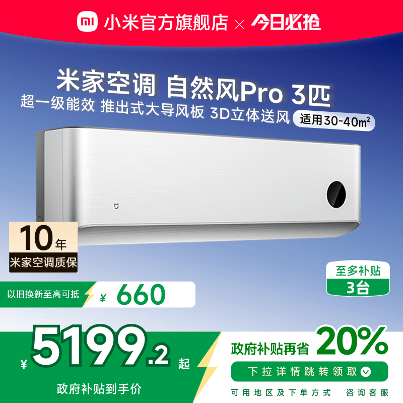 小米米家空调自然风Pro3匹超一级能效壁挂冷暖变频挂机家用客厅