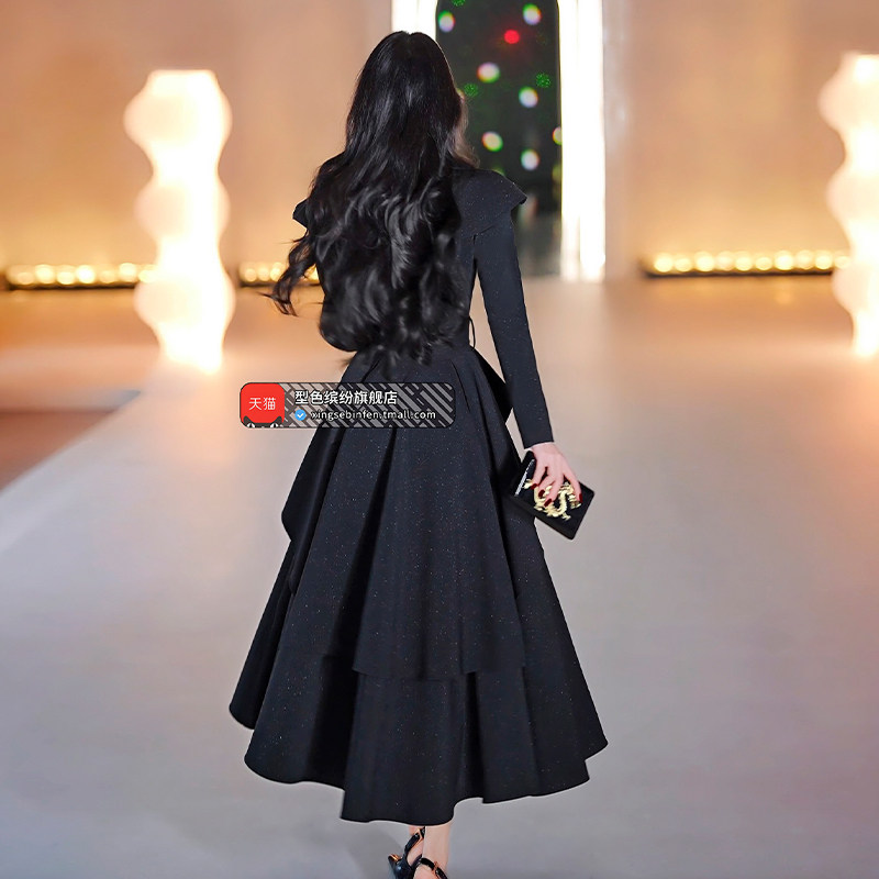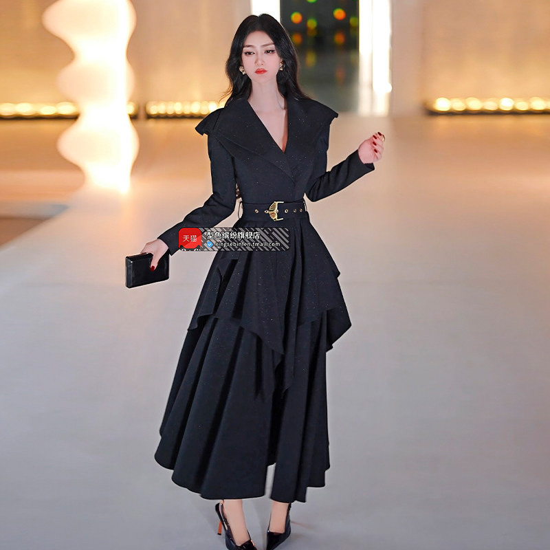 春季原创高定长裙新品气质收腰显瘦荷叶边长款过膝连衣裙
