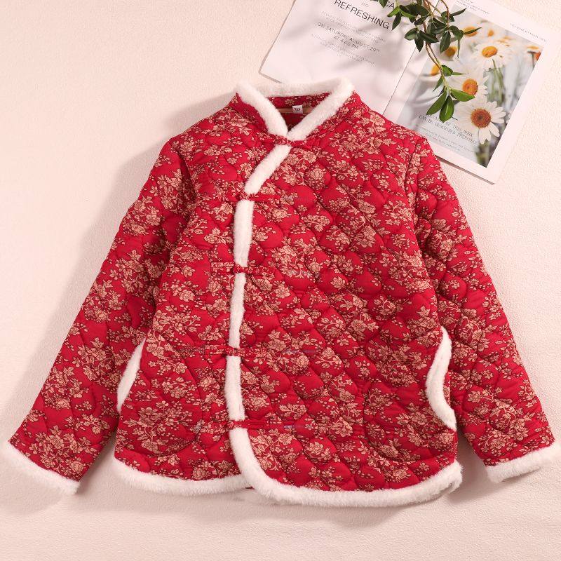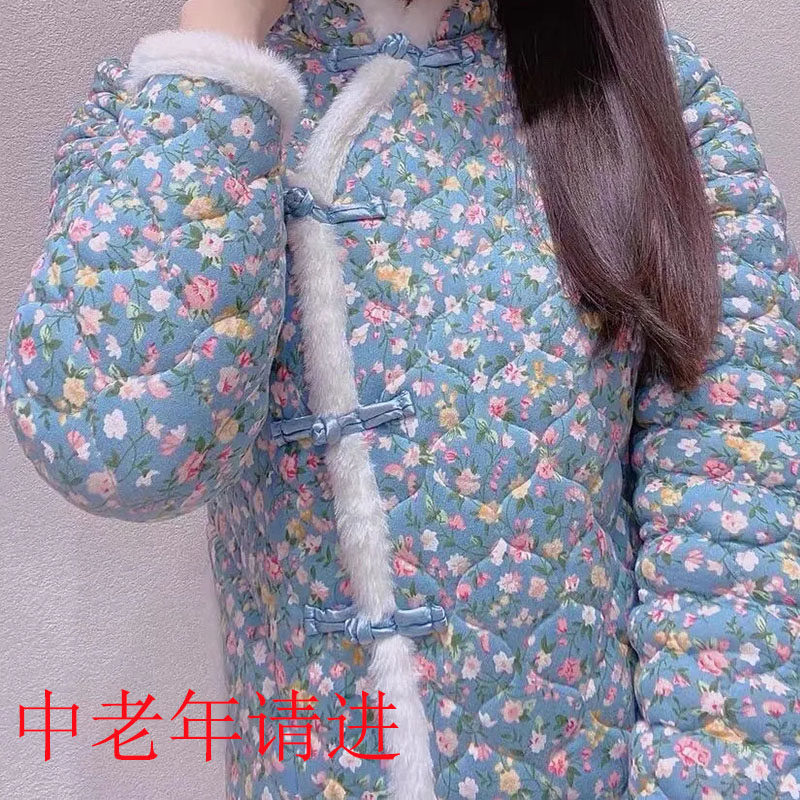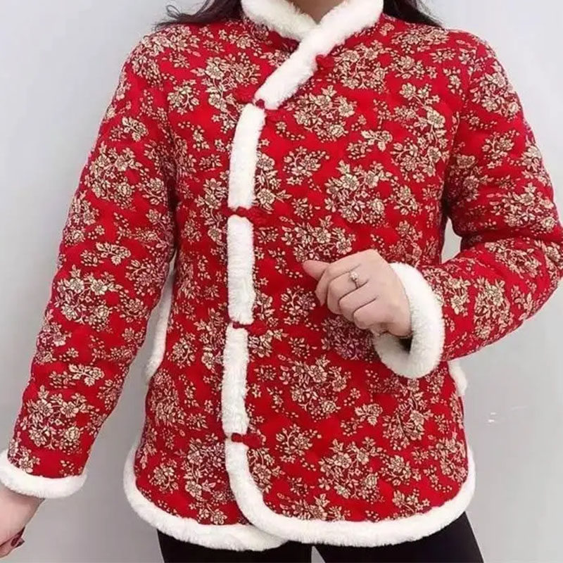 棉服冬中国加厚棉袄复古妈妈东北旗袍棉衣外套中老年大红红花新款
