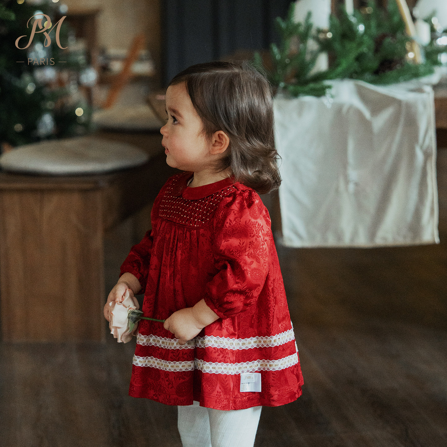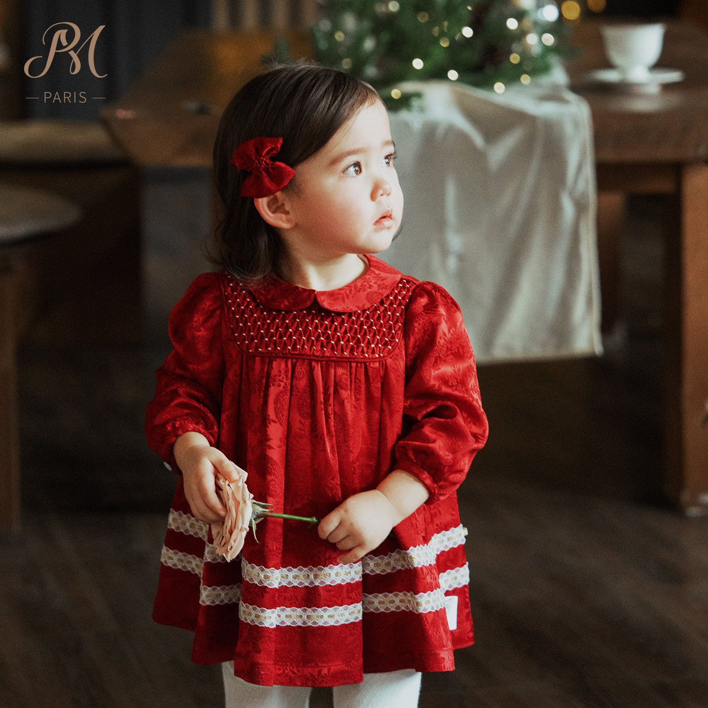Petite Marguerite小雏菊婴童·手工蜂巢褶红色娃娃领连衣裙
