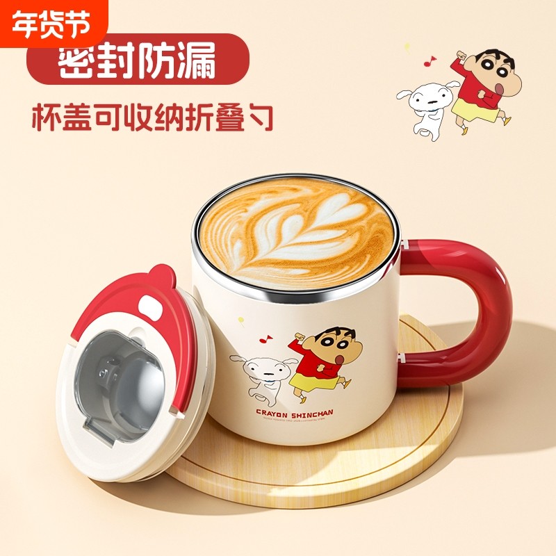 蜡笔小新杯子家用喝水杯办公室不锈钢马克杯带盖带勺冲泡杯咖啡杯