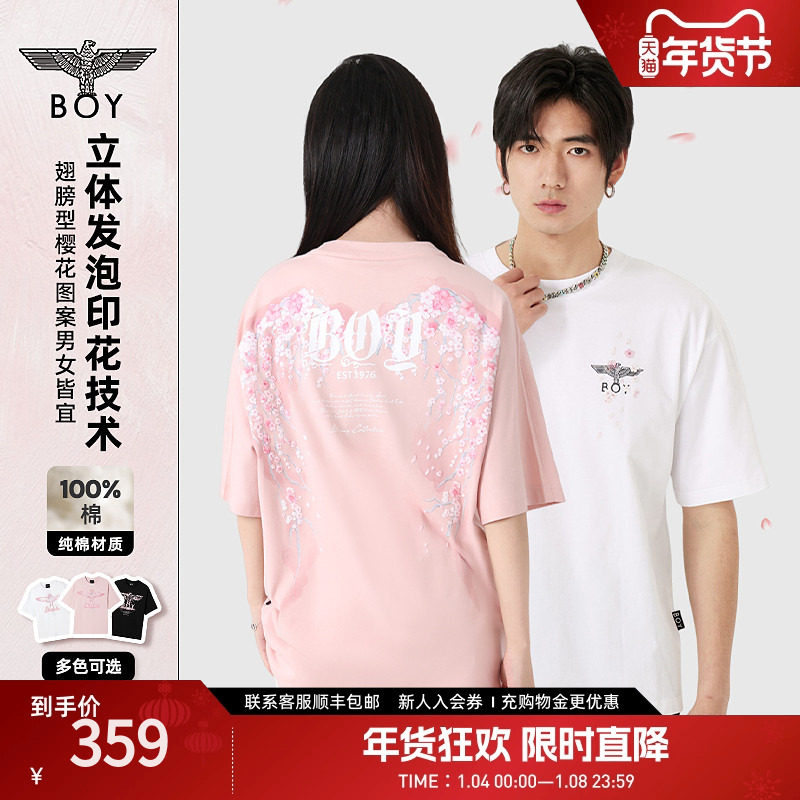 【繁花】BOYLONDON潮牌情侣款短袖樱花翅膀花卉印花T恤N01712