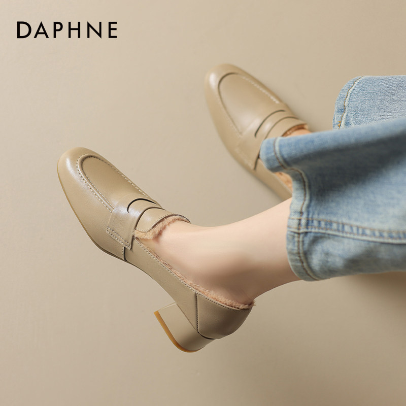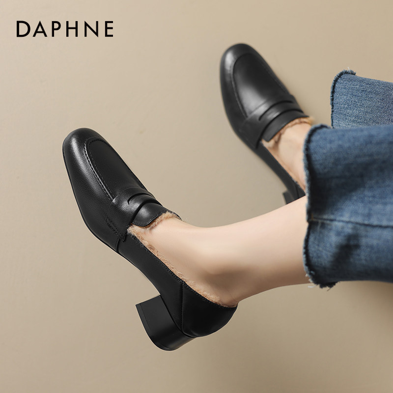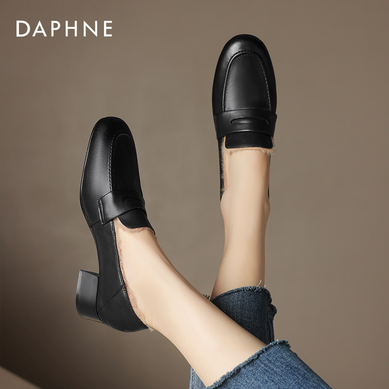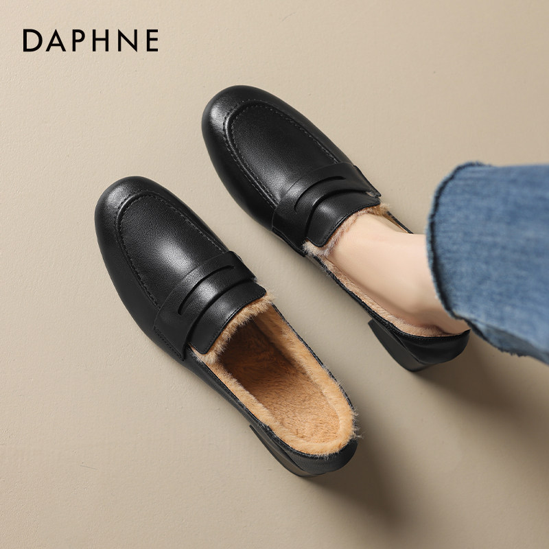 达芙妮粗跟乐福鞋女2026新款冬季毛毛鞋加绒棉鞋圆头小皮鞋豆豆鞋