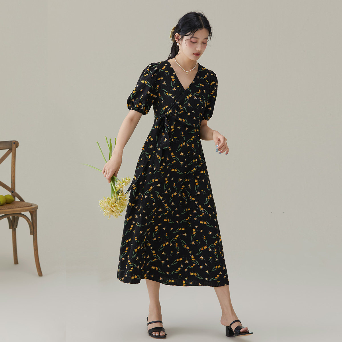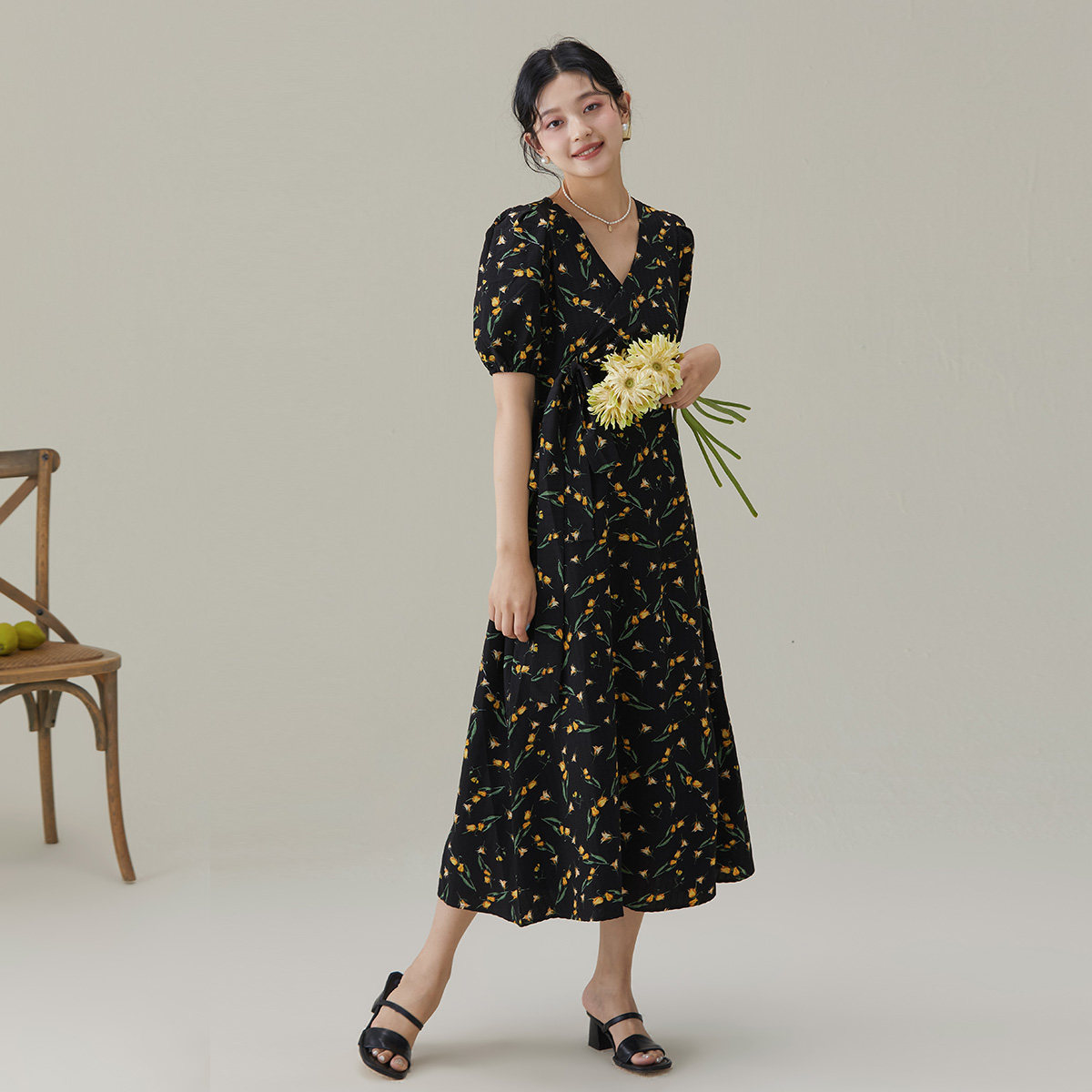 one more短袖碎花连衣裙女2025夏季新款法式泡泡袖雪纺裙气质裙子