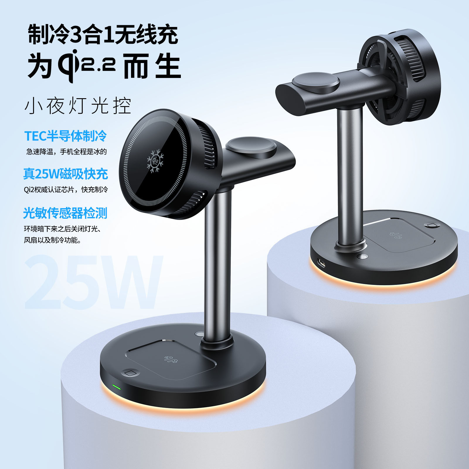 qi2.2 25W冰磁制冷手机无线充电器跨境新品立式三合一磁吸无线充