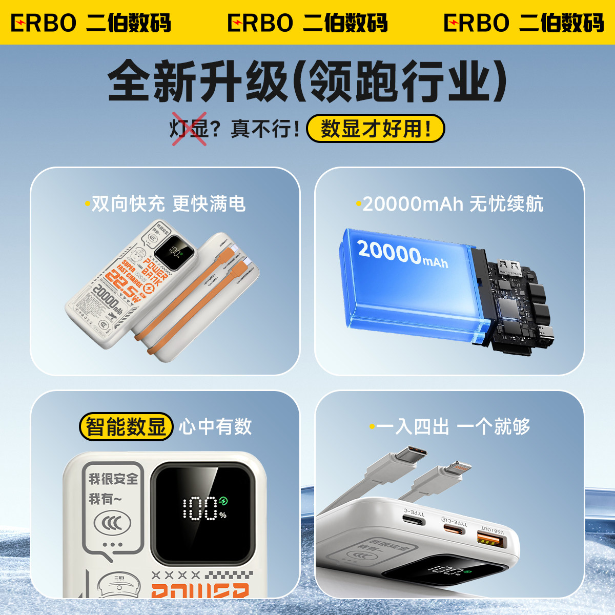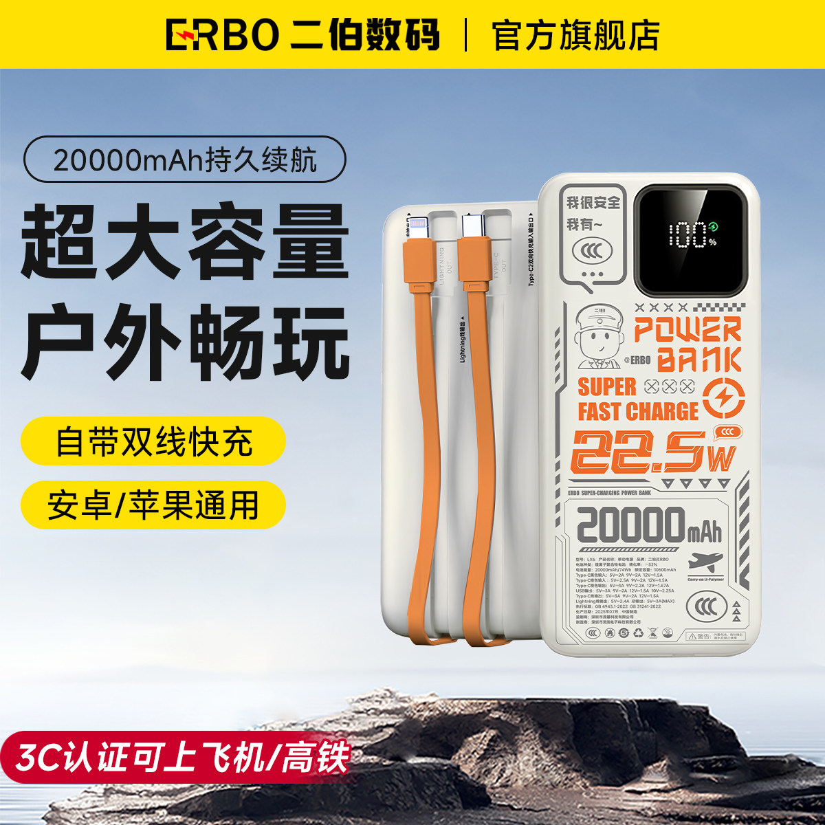 二伯2026新款充电宝快充大容量50000毫安自带线超薄小巧便携移动电源适用于iphone17苹果15官方高铁飞机可带