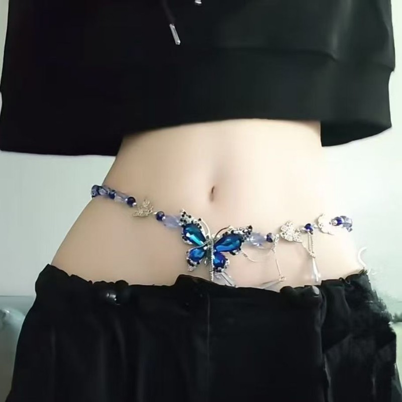 蝴蝶流苏镶钻2025新款重工复古蓝色流苏锁骨链choker腰链