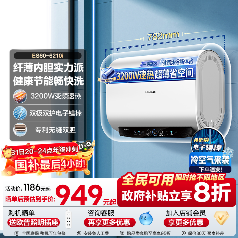海信60L家用扁桶超薄洗澡一级智能储水式双胆电热水器6210 UD