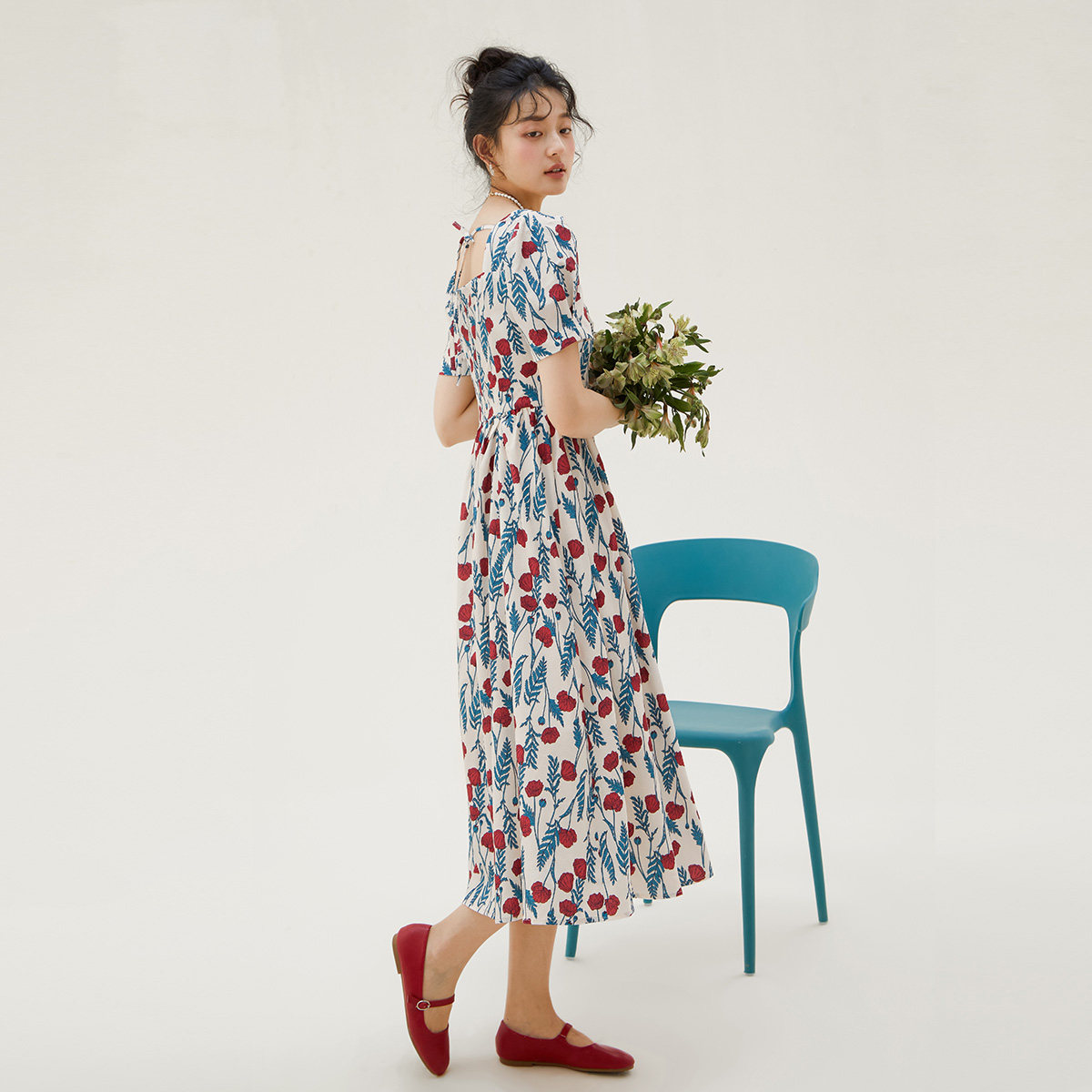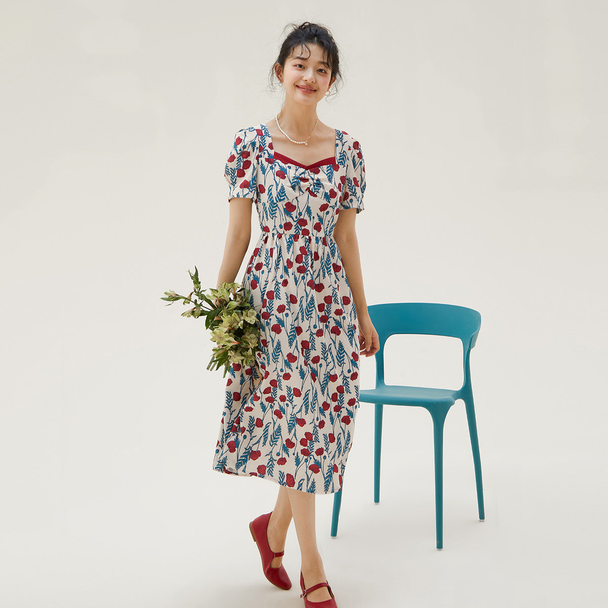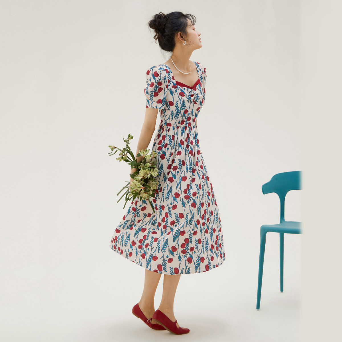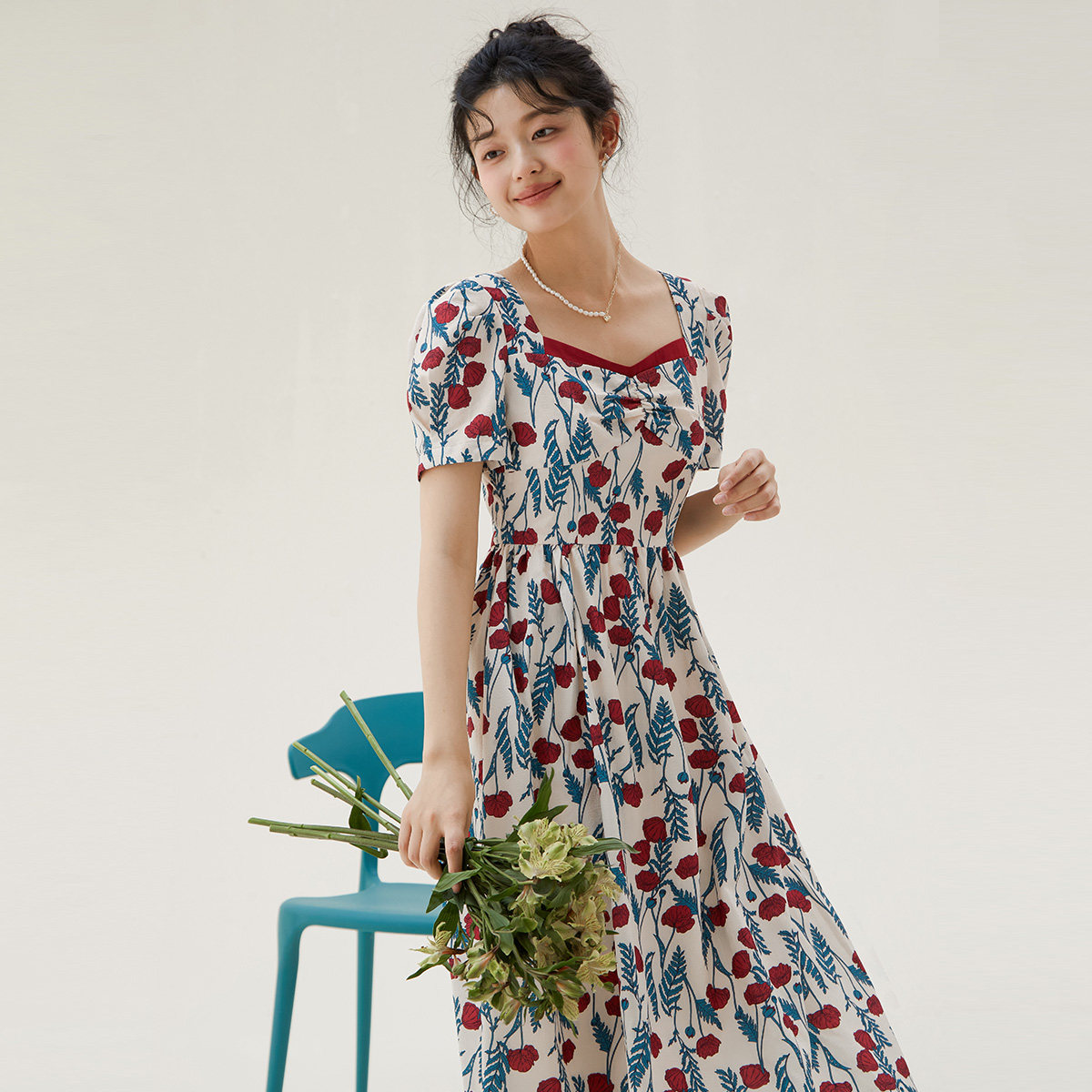 one more气质碎花修身连衣裙女法式方领短袖裙子高级感a字裙长裙
