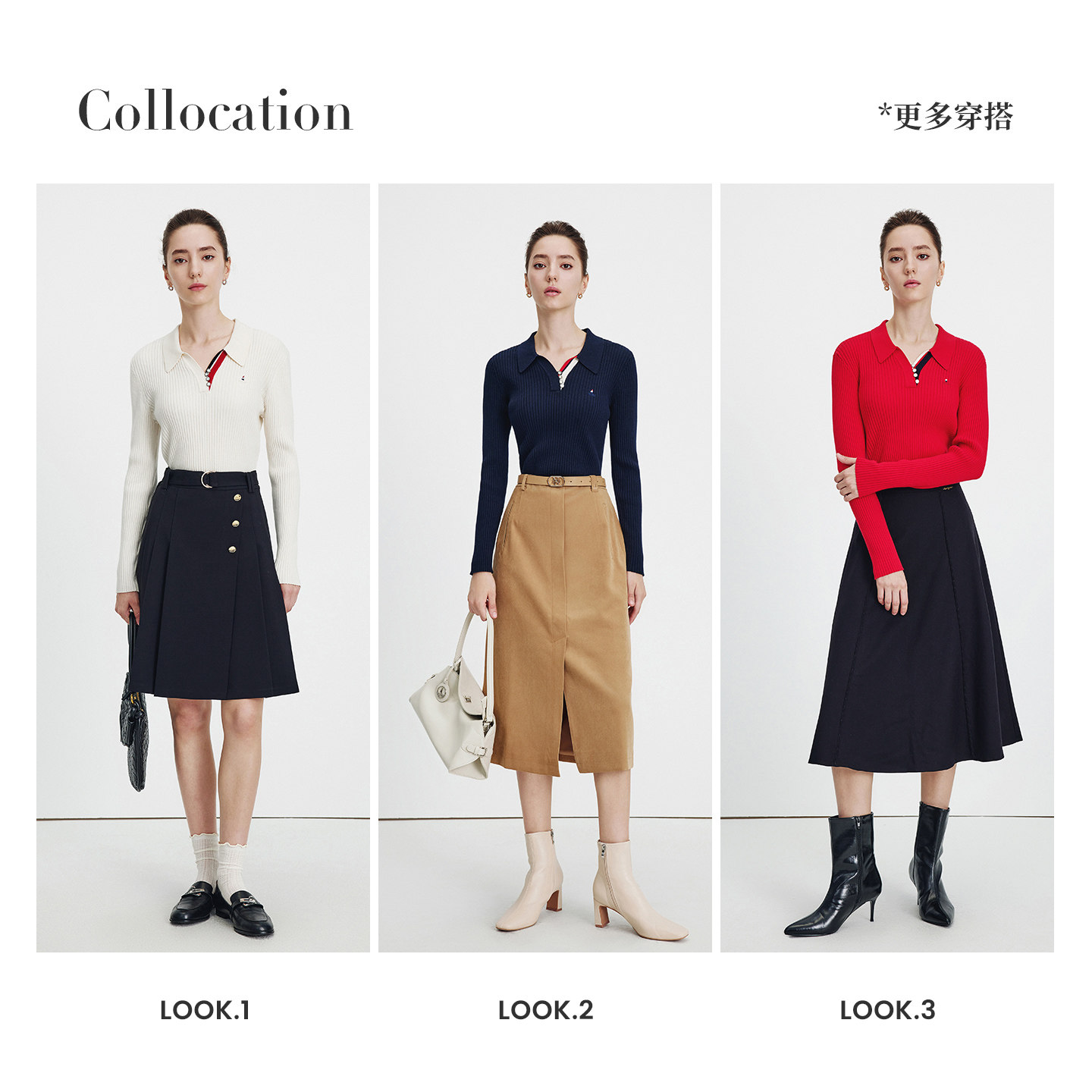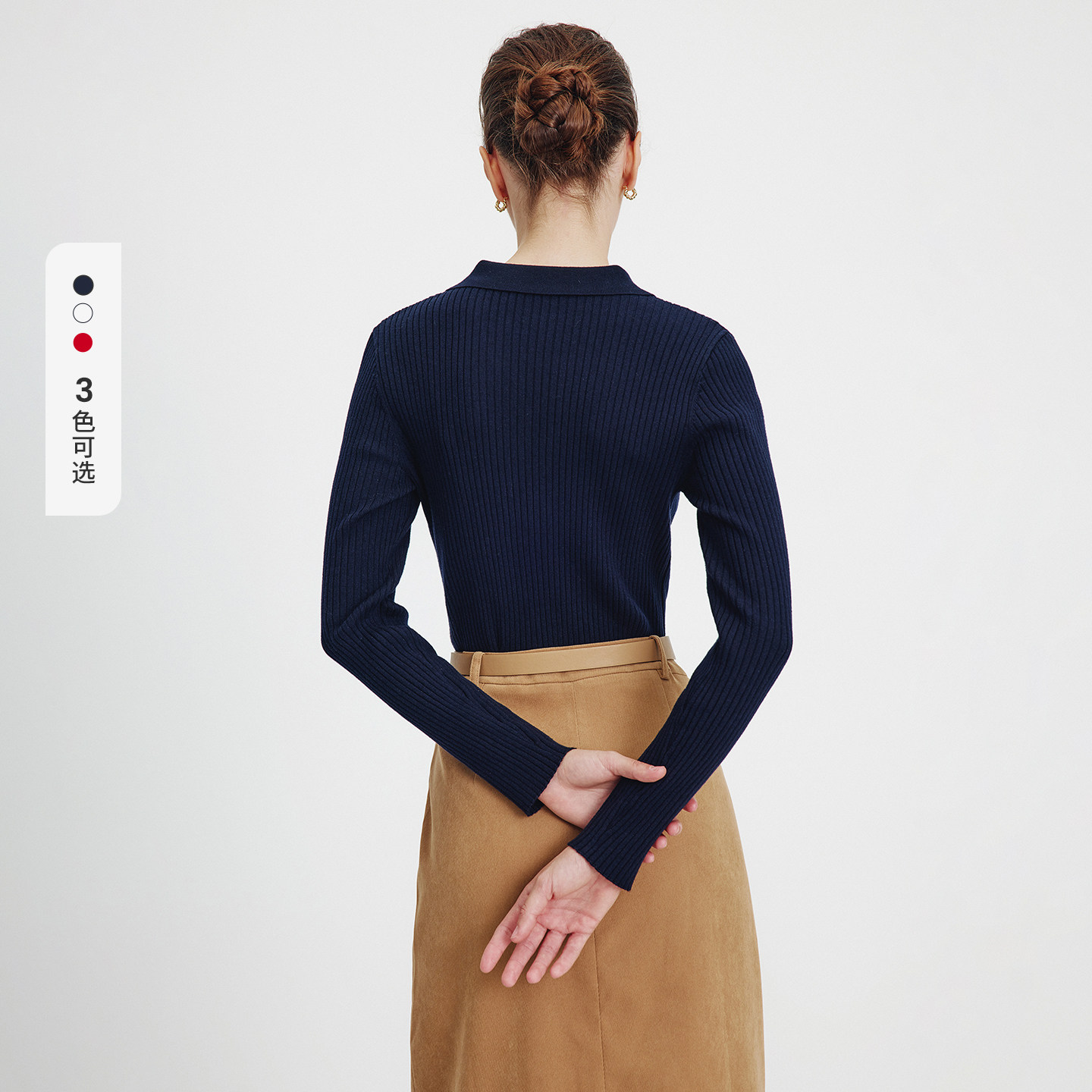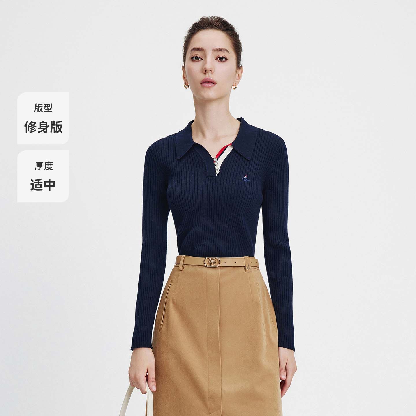 Navigare意大利小帆船翻领时尚羊毛衫女秋冬新款修身通勤针织衫