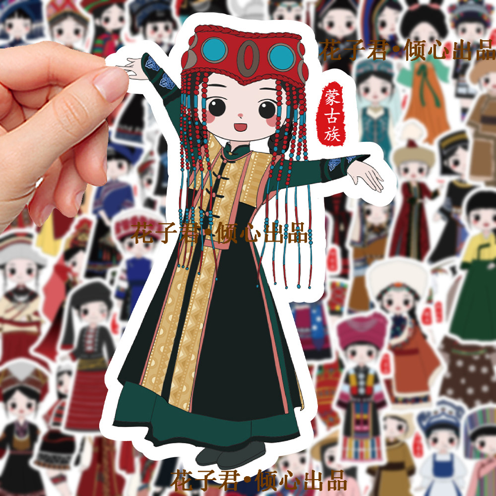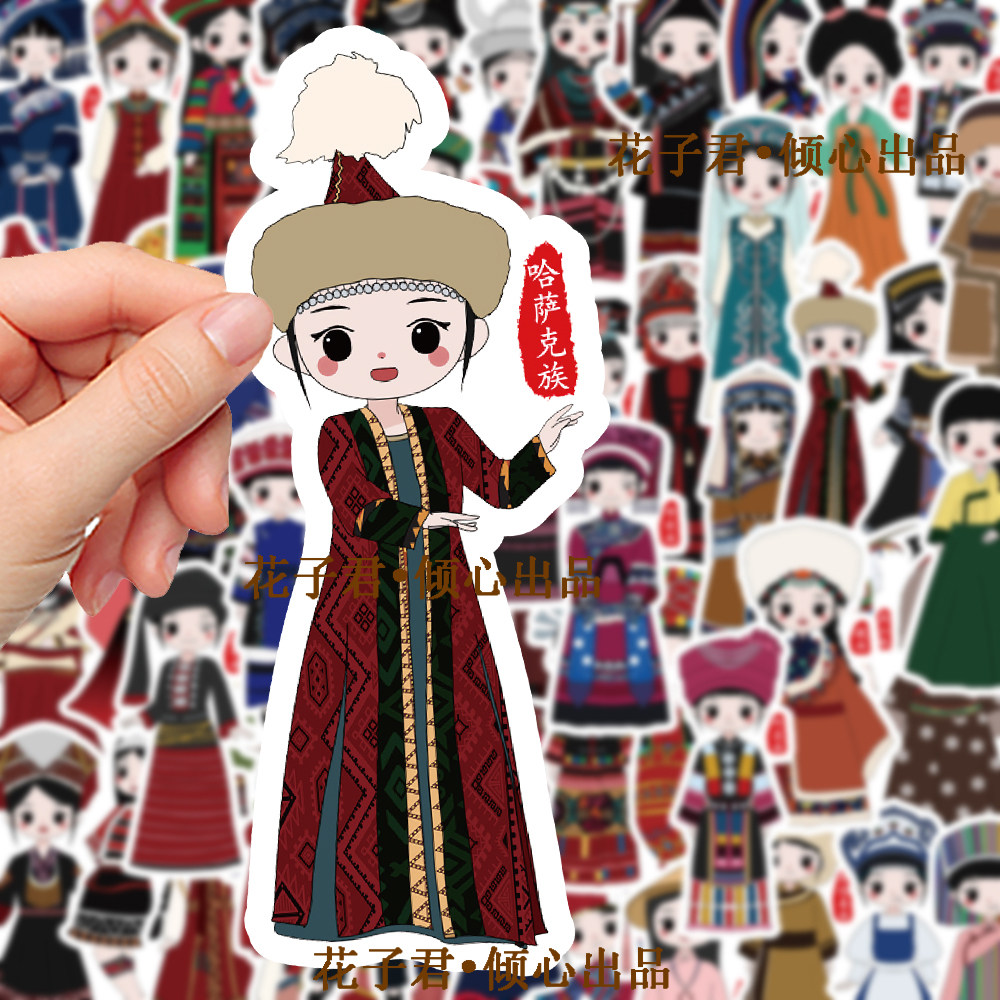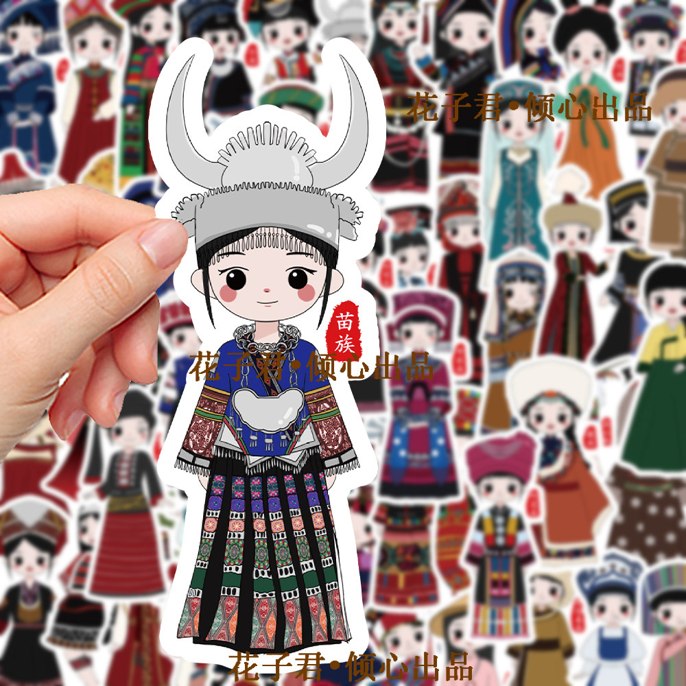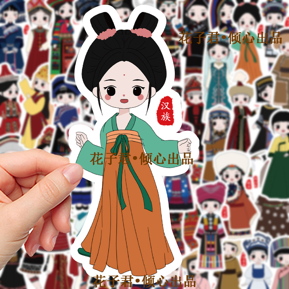 56个民族贴纸卡通中国传统服装人物创意精美国潮汉服diy手账手机