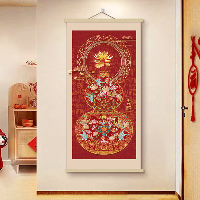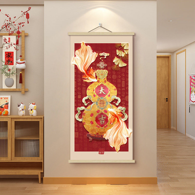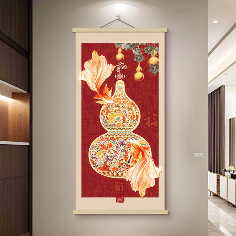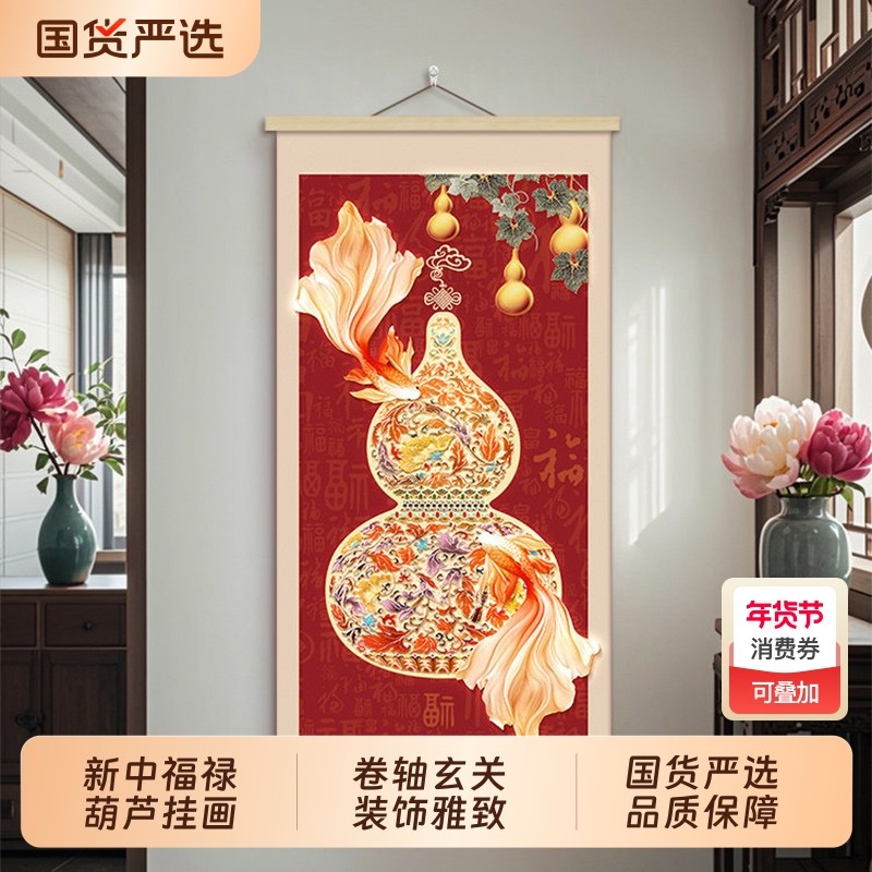 新中式玄关装饰画卷轴挂画福禄葫芦入户对门壁画锦鲤走廊过道挂布