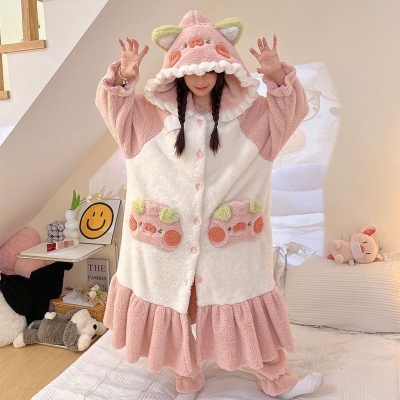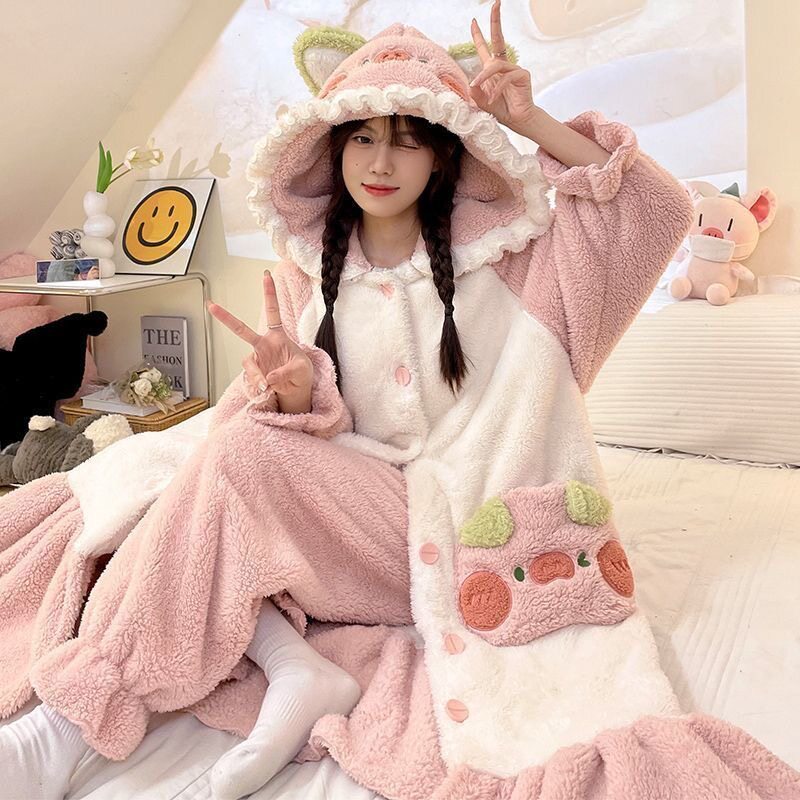 2026款大码网红妹粉色猪猪连帽睡衣女冬加绒加厚珊瑚绒家居服睡袍