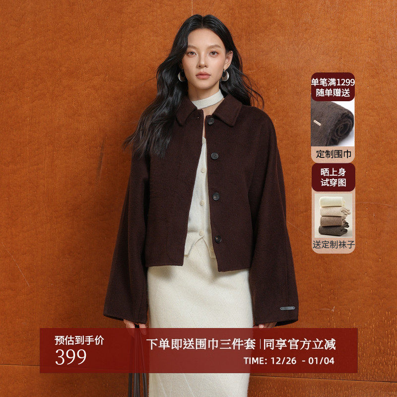 AIRIQI冬季新款质感短款翻领双面呢暗门襟羊毛毛呢外套AH44DY089