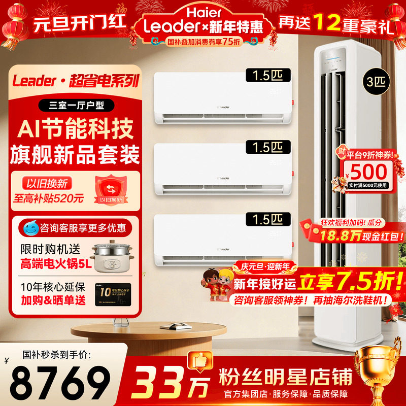 [三室一厅套装]海尔空调统帅1.5匹挂机一级变频3匹柜机冷暖旗舰店