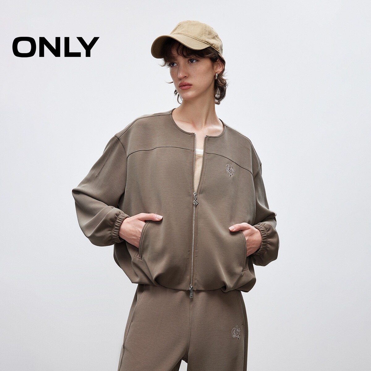 ONLY春季运动风双向拉链精致刺绣宽松落肩圆领开衫卫衣上衣女
