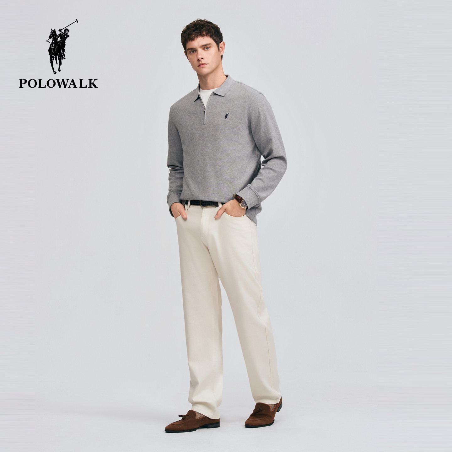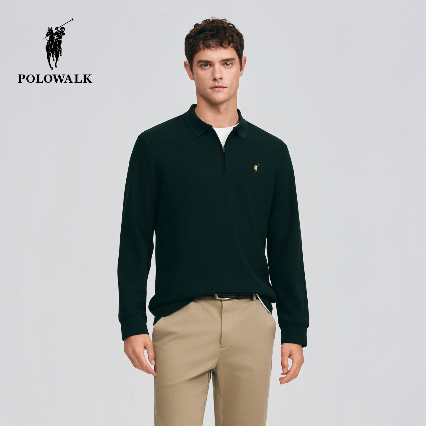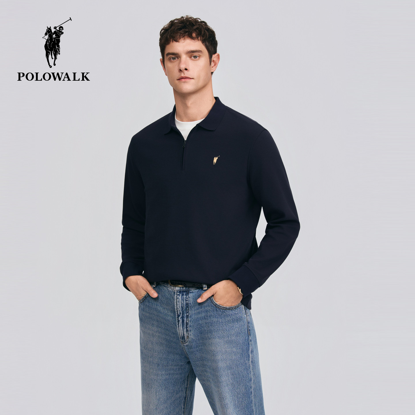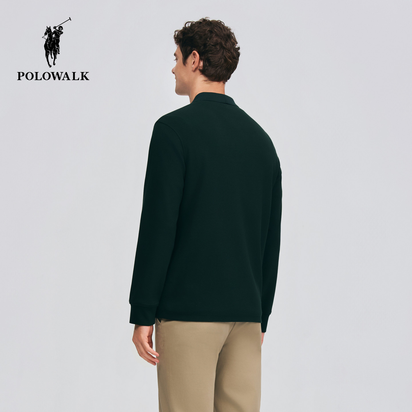 POLOWALK男士T恤衫2026春季新款翻领纯色长袖套头衫简约休闲上衣