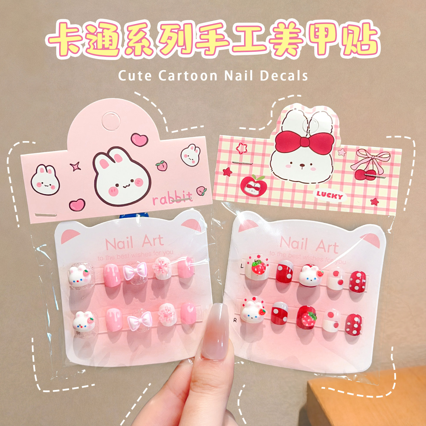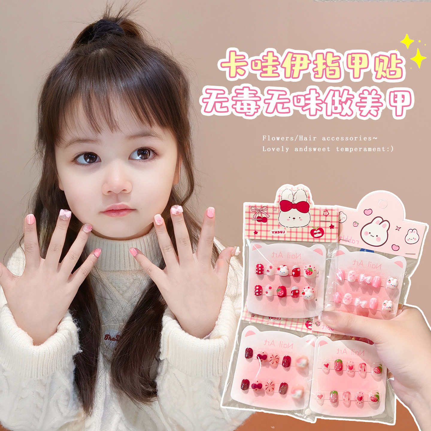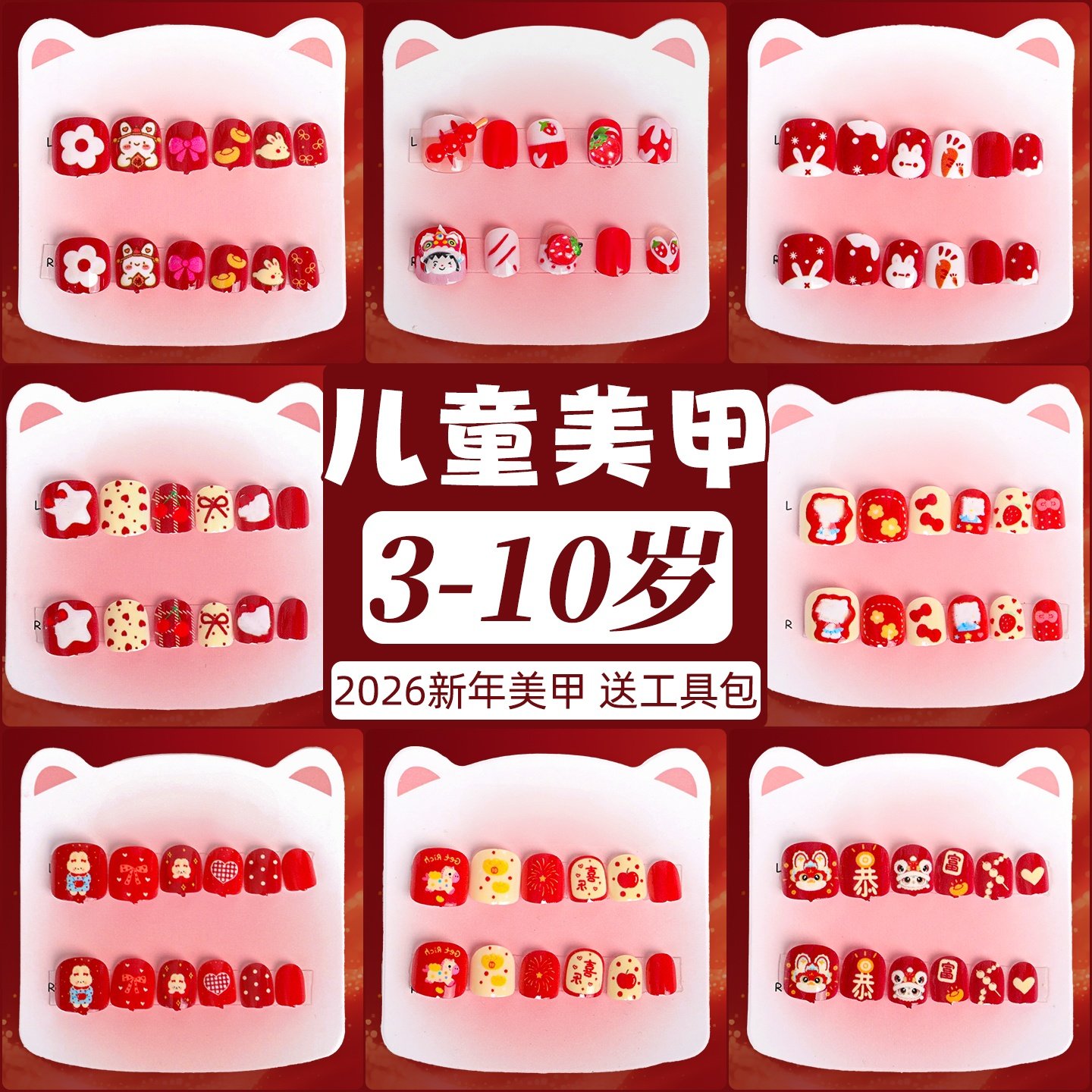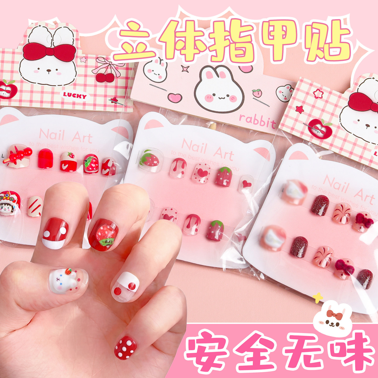 新年美甲儿童穿戴甲3-10岁短款高级指甲贴女童卡通猫咪水钻立体贴纸防水新款手工小学生软甲果冻贴片女孩贴画