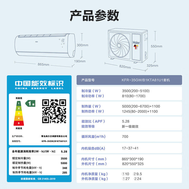 【镇店爆款】海尔空调净省电Plus1.5匹1匹家用官方新一级挂机35E1
