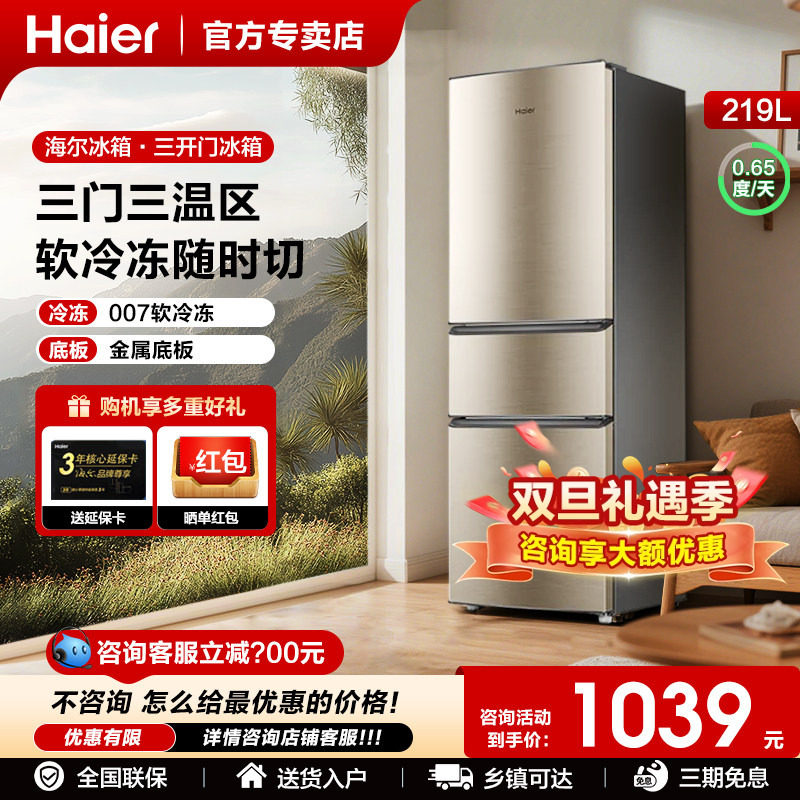 以旧换新补贴海尔电冰箱三开门219升182家用小型节能冷冻微霜出租