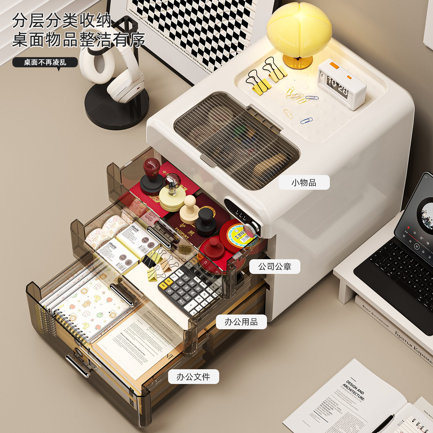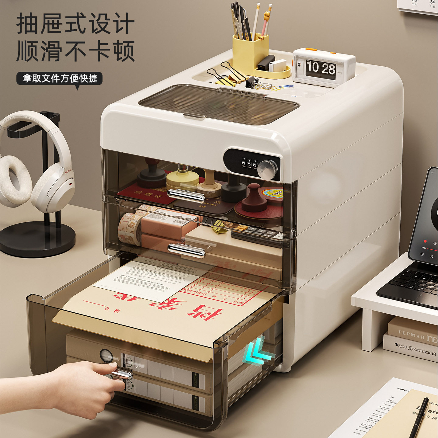 桌面密码收纳盒抽屉式重要文件带锁收纳箱家用办公隐私物品储物柜