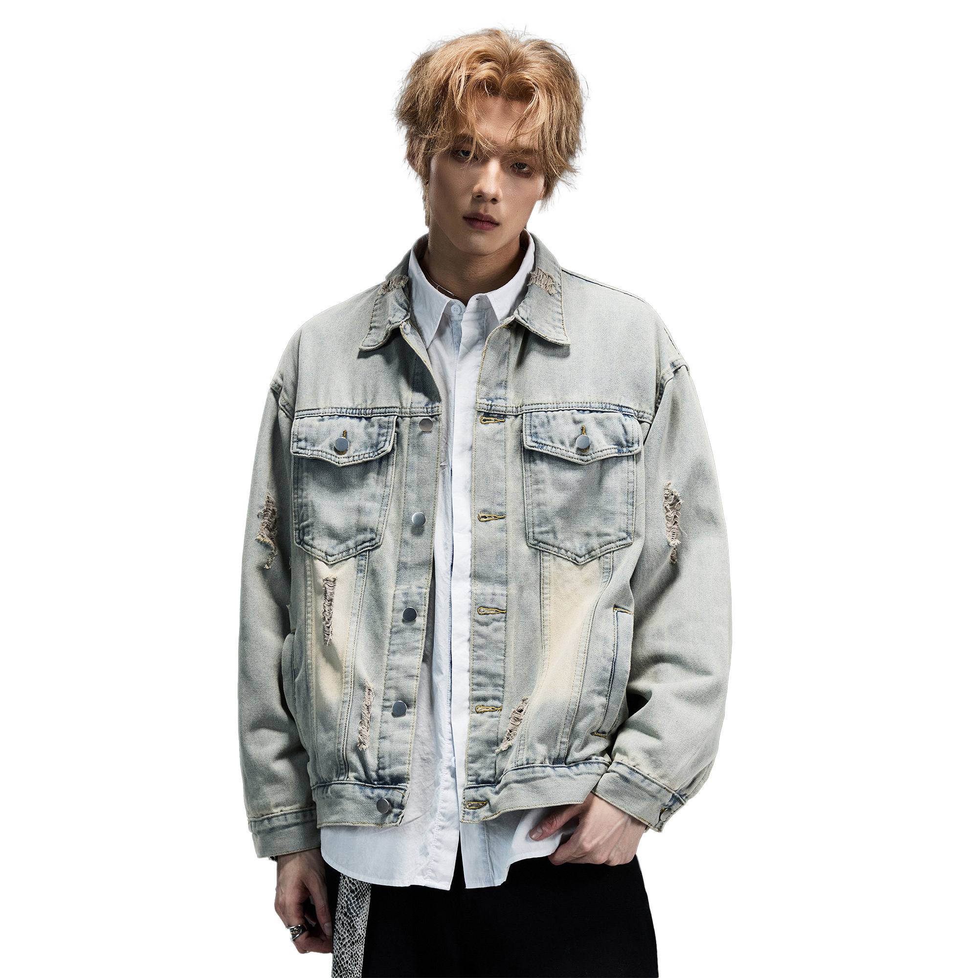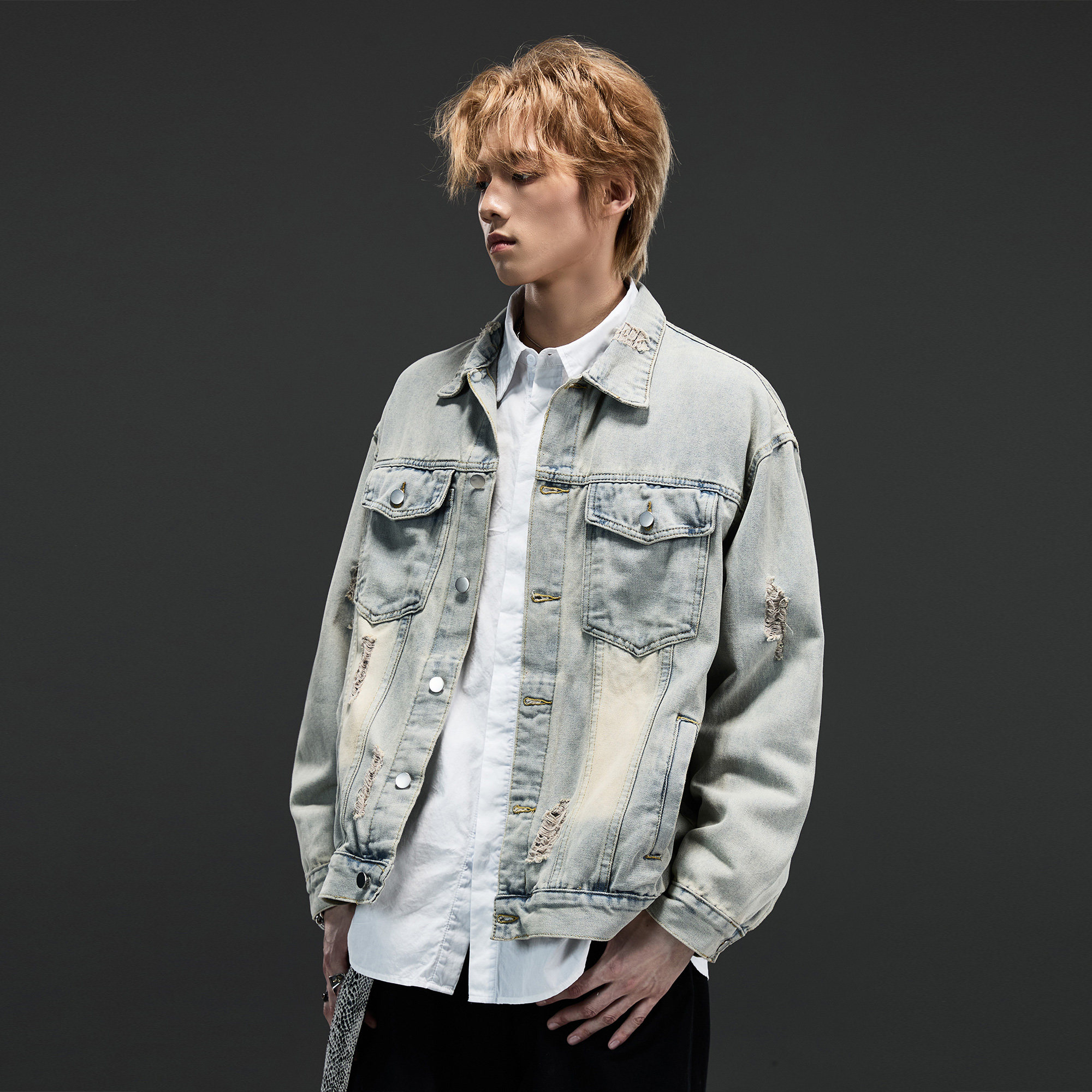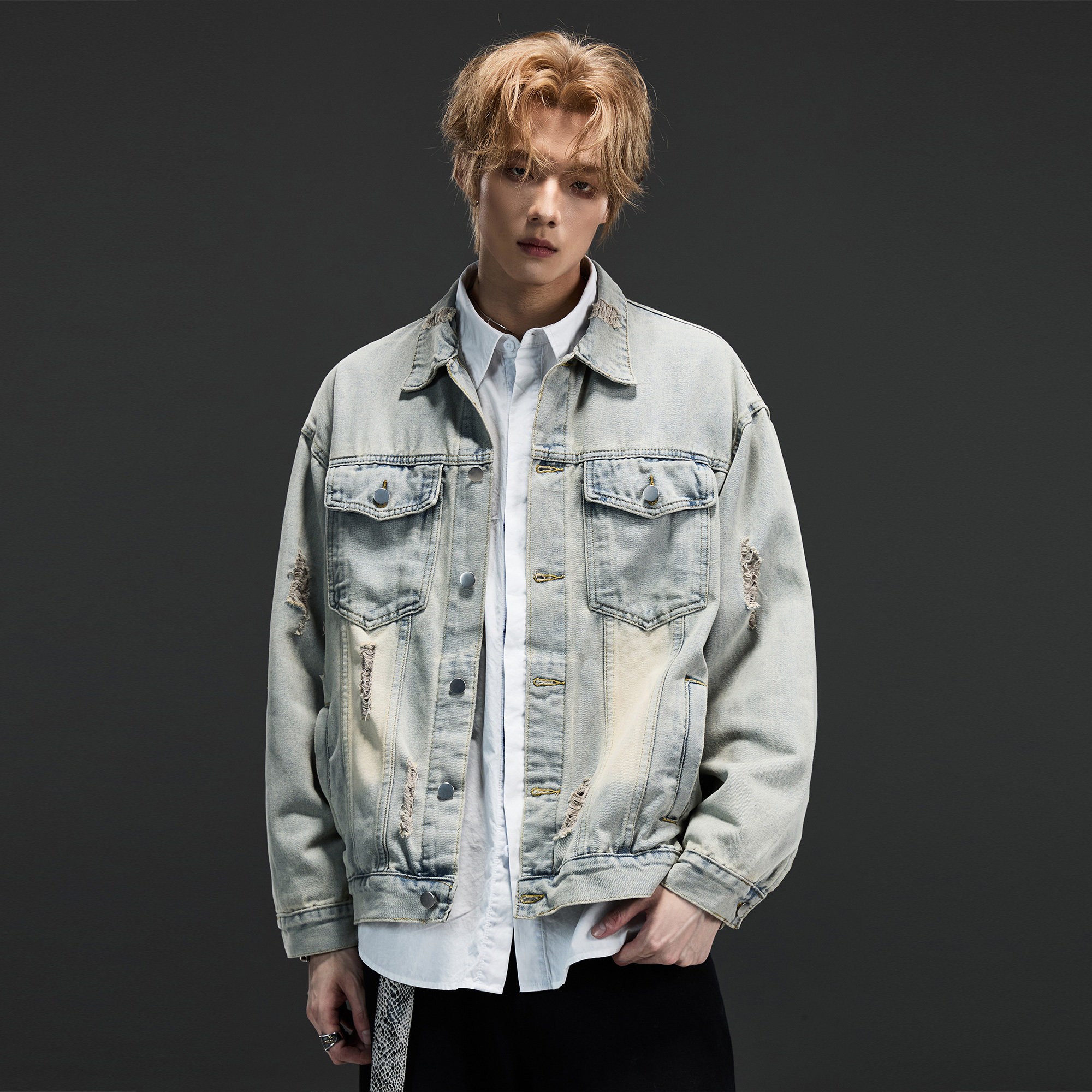 ALLIN 破洞水洗做旧牛仔外套男秋冬美式复古宽松潮牌情侣翻领夹克