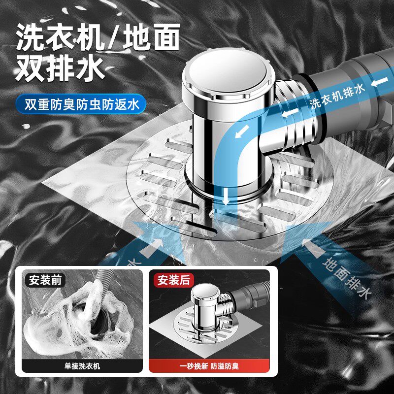 洗衣机地漏专用接头下水排水管道防反溢水二合一三通方形地漏盖子