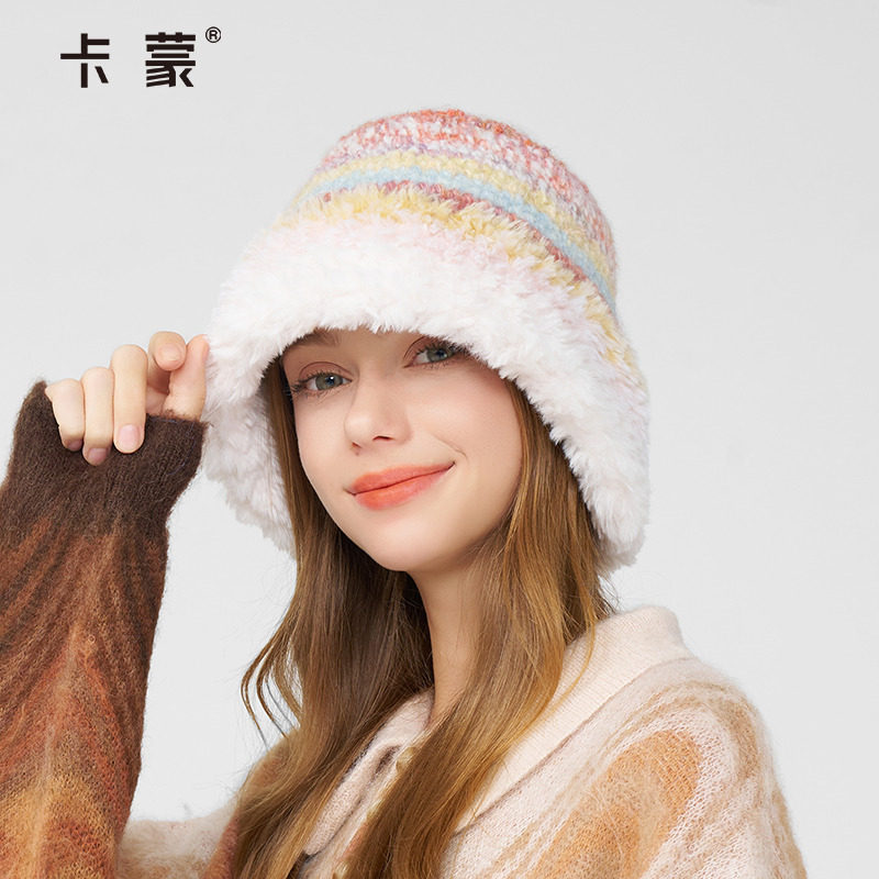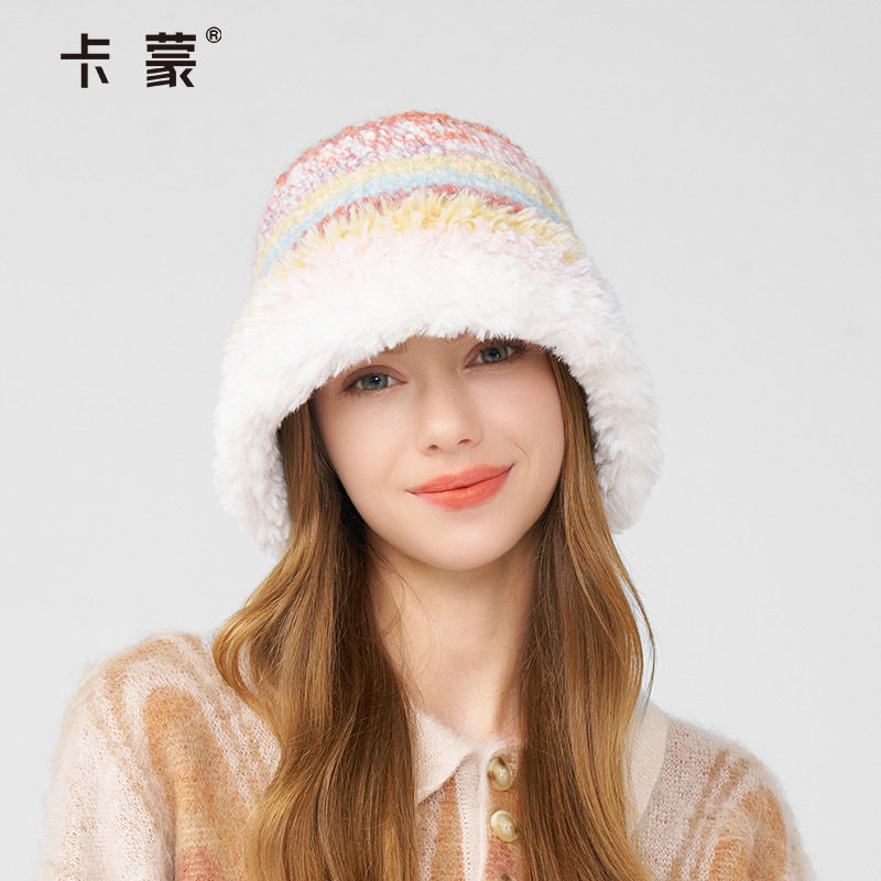卡蒙手工编织多巴胺彩虹色可爱毛线帽女可折叠护耳毛绒羊毛渔夫帽