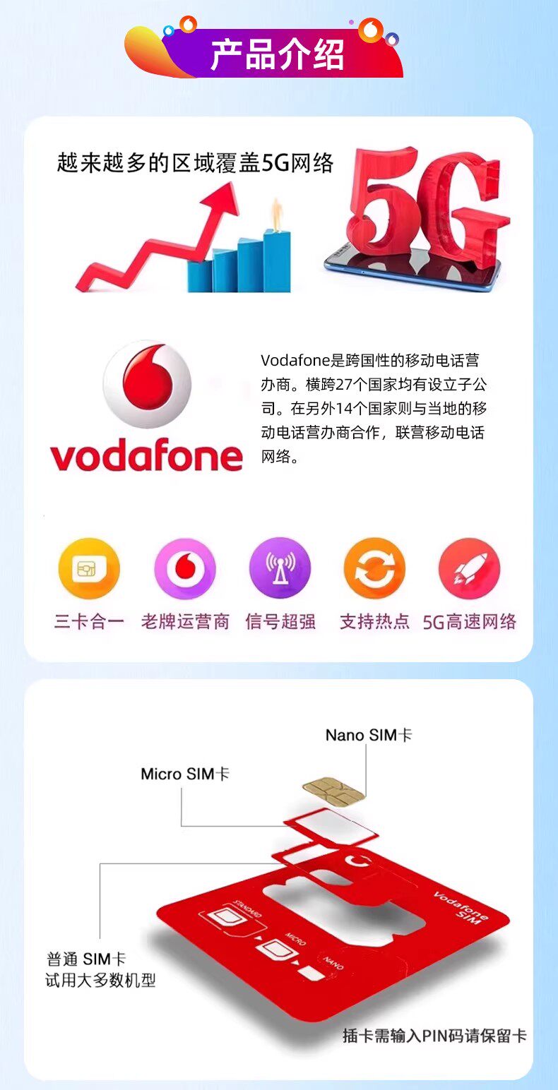 欧洲电话卡法国欧盟多国沃达丰通用5g高速流量上网手机卡机场自取