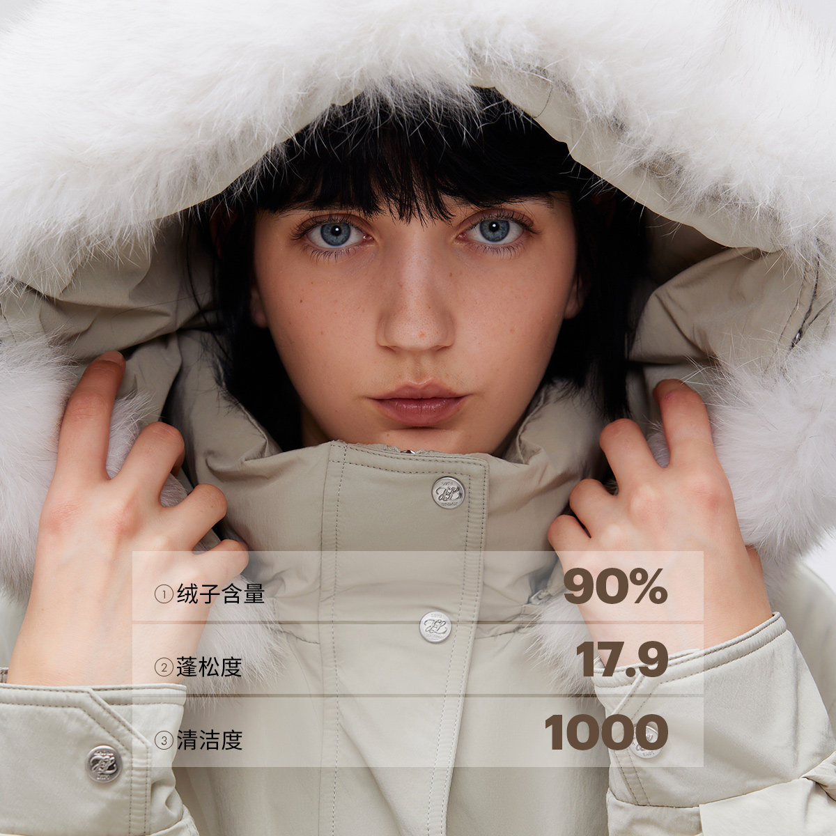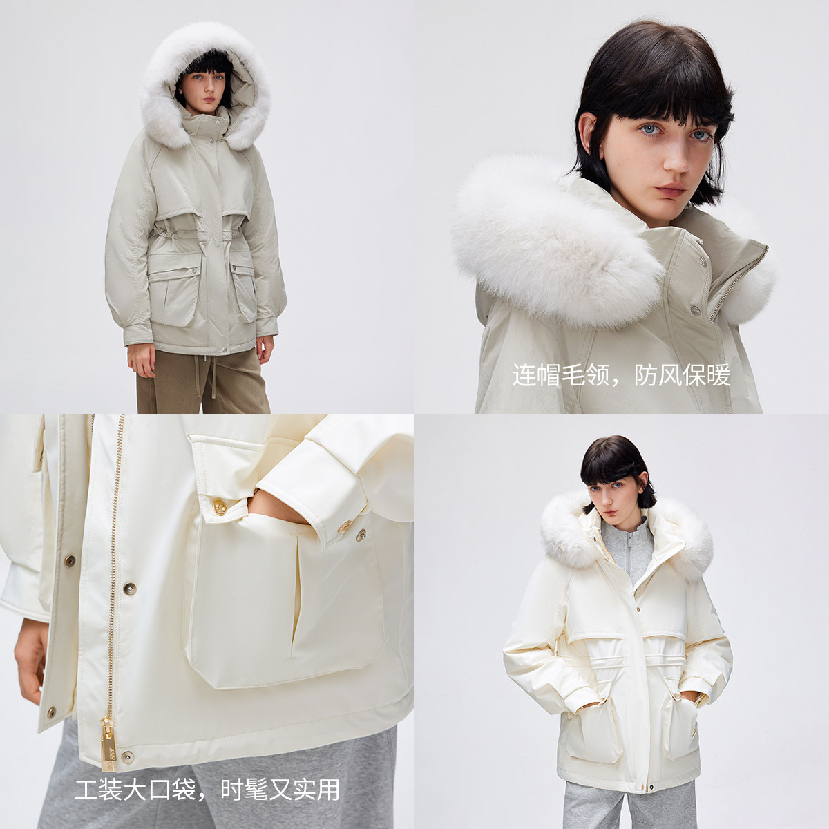 毛领羽绒服,顺滑双向拉链,可调节收腰设计