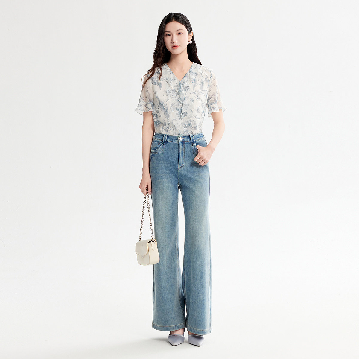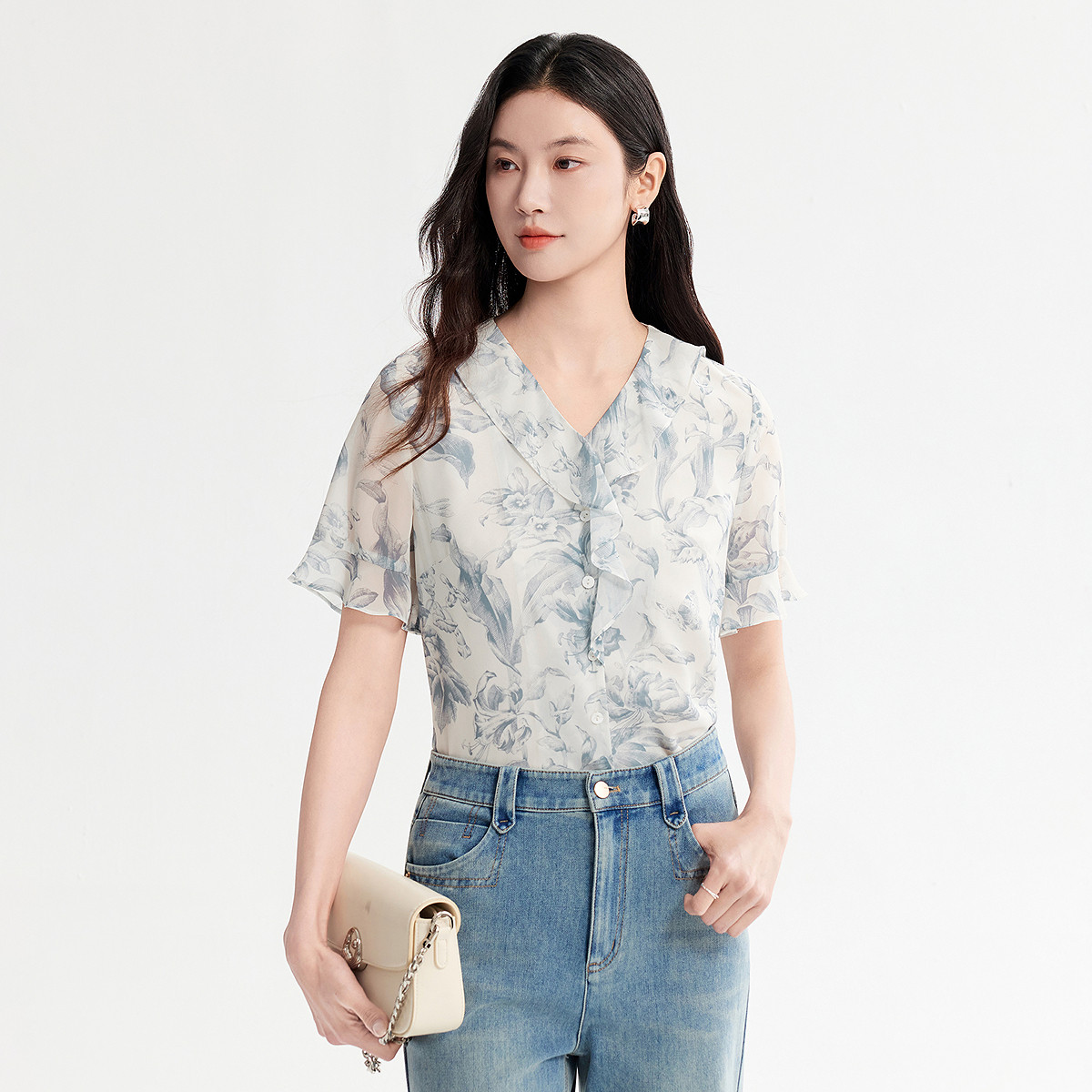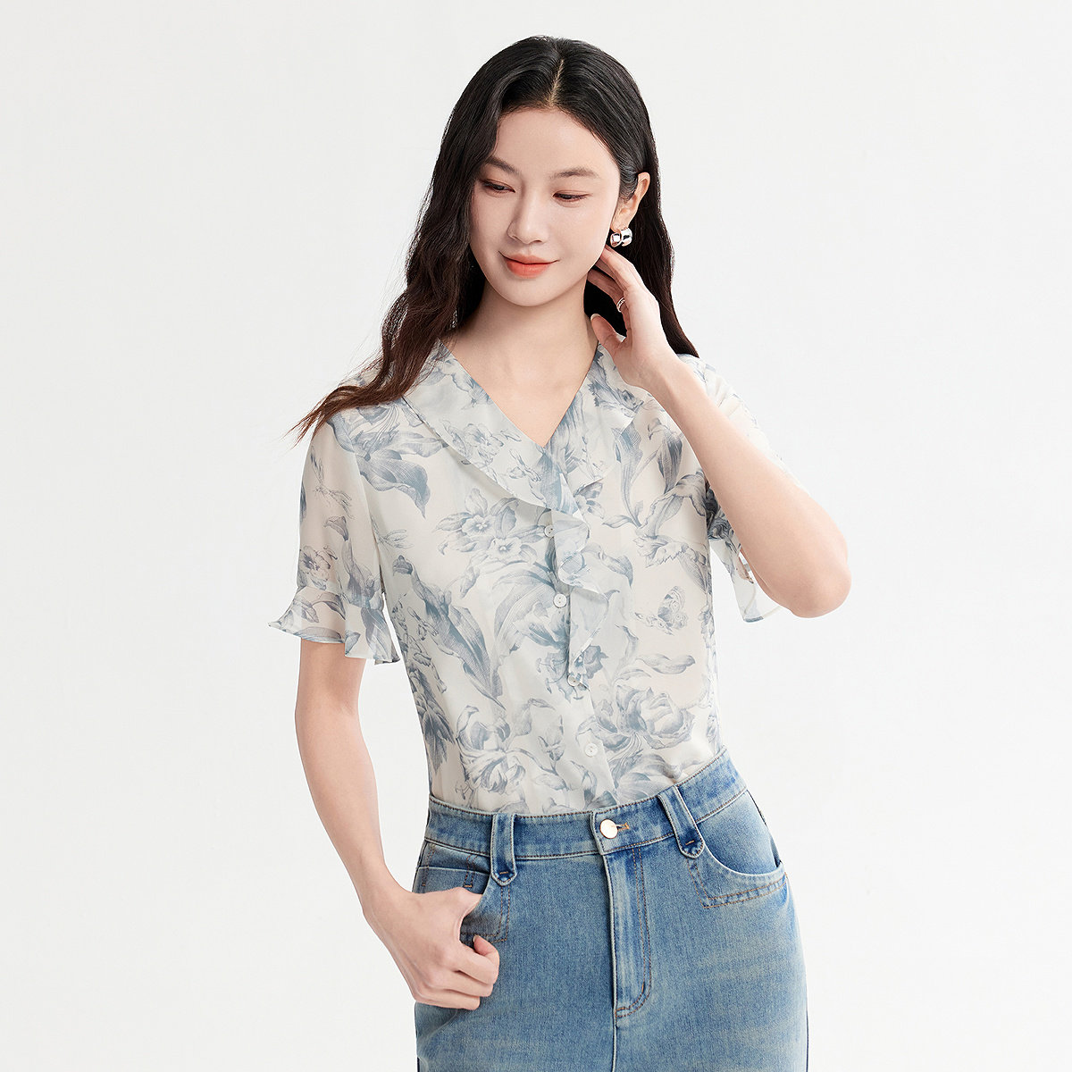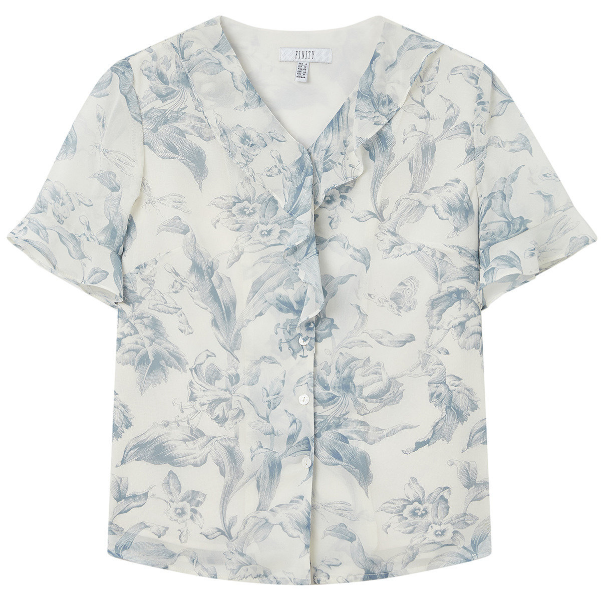 FINITY菲妮迪衬衫26年夏季新款简约荷叶边设计感印花短袖上衣女装
