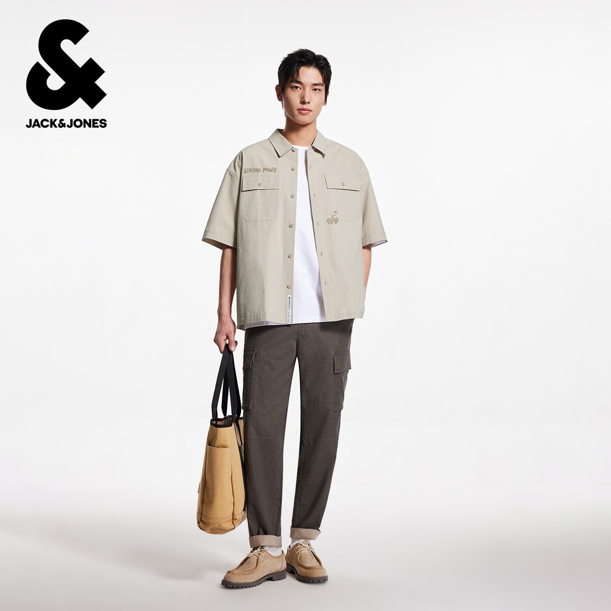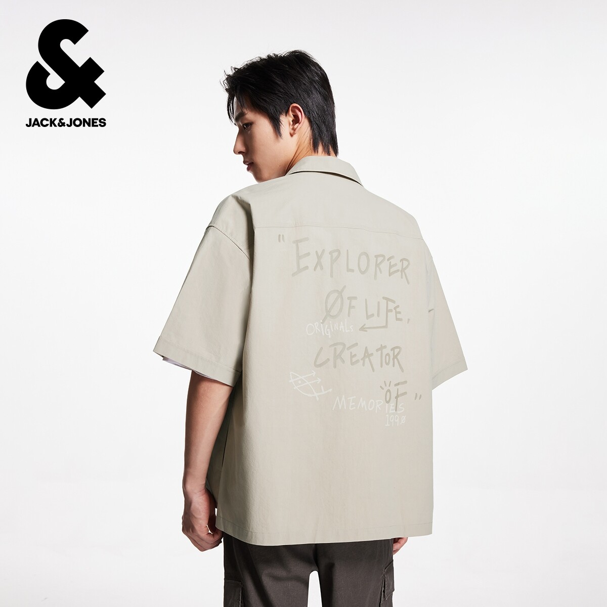 杰克琼斯奥特莱斯男装夏季短袖衬衫舒适纯棉字母刺绣宽松休闲上衣