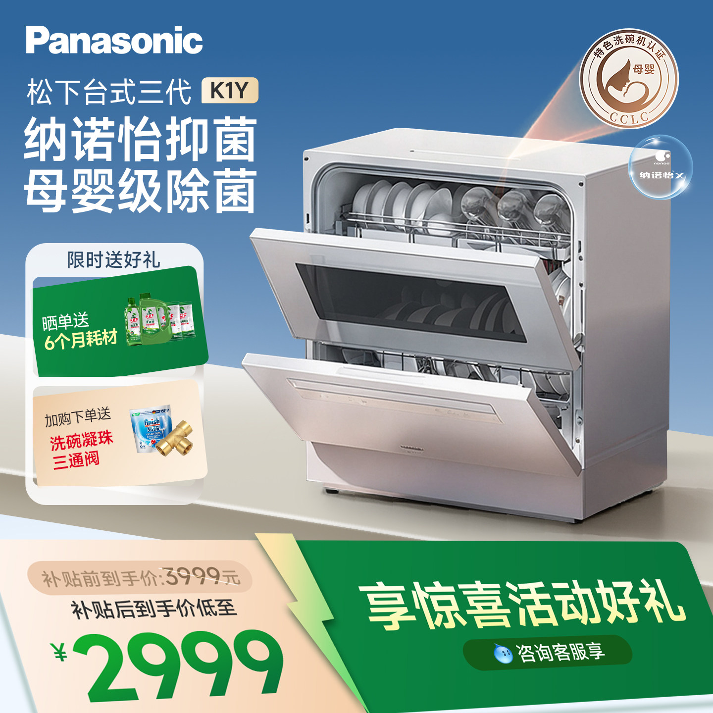 松下台式洗碗机母婴级除菌免安装家用台面5套智能全自动三代K1Y