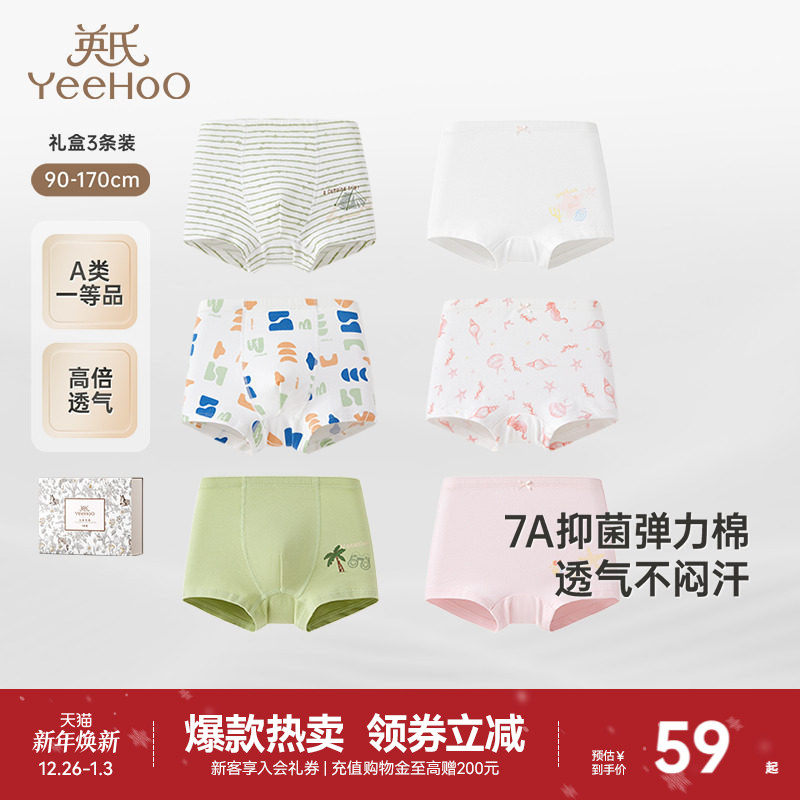 英氏儿童内裤礼盒装透气7A抑菌宝宝平角裤男女童打底短裤不夹屁屁