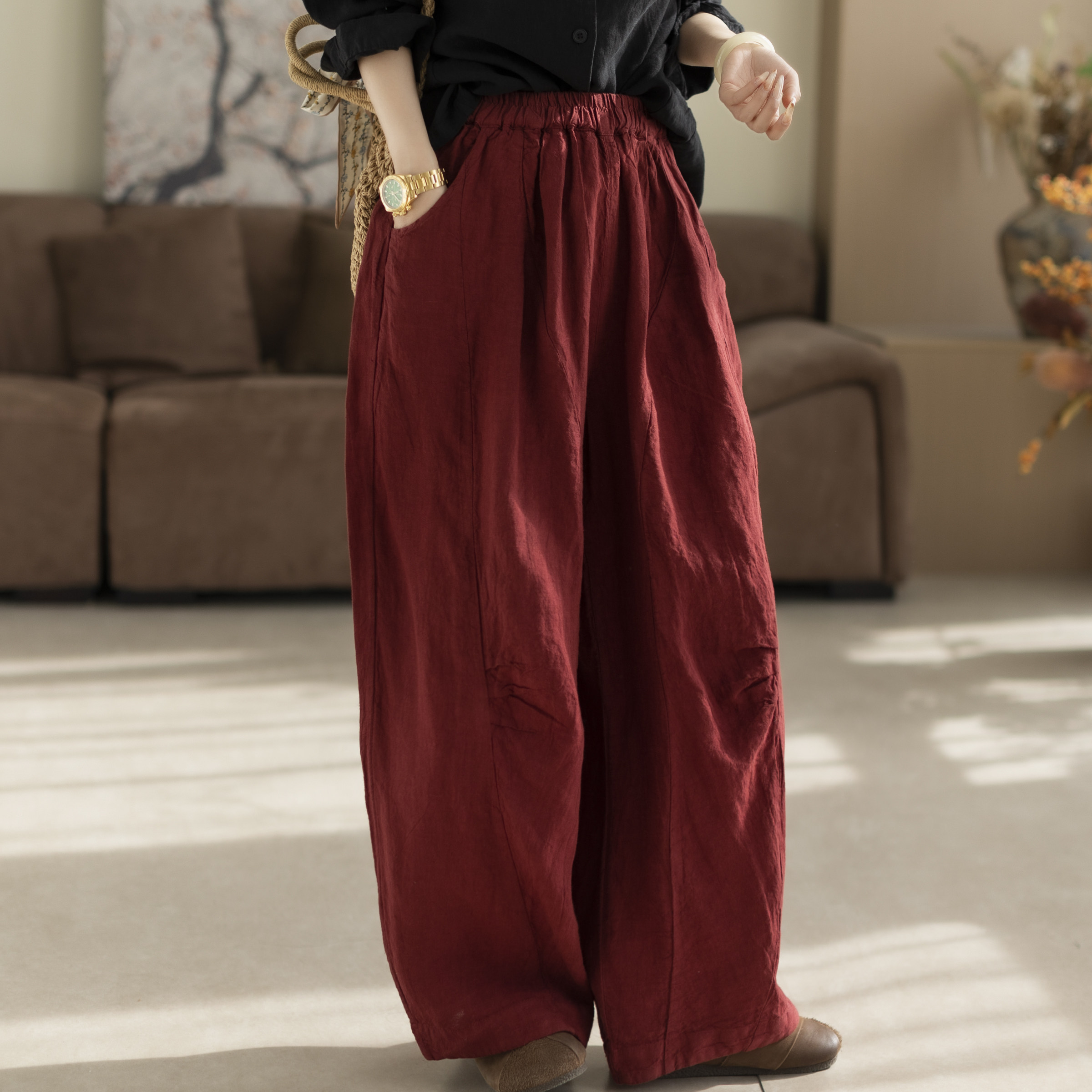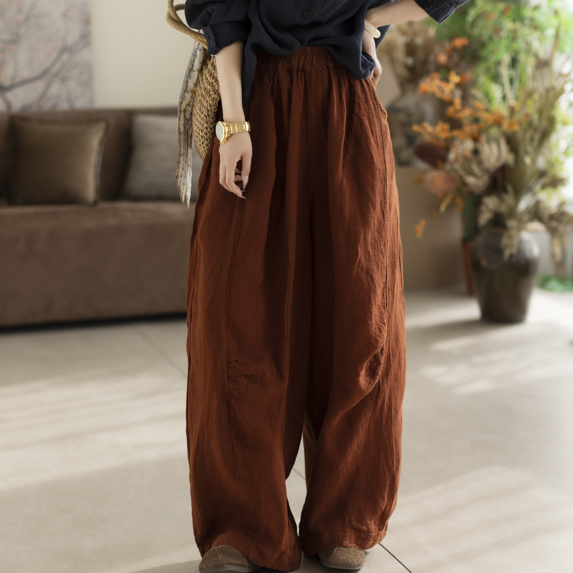 咖咪羽亚麻休闲裤女春秋直筒纯色女士宽松流行显瘦气质女装裤子