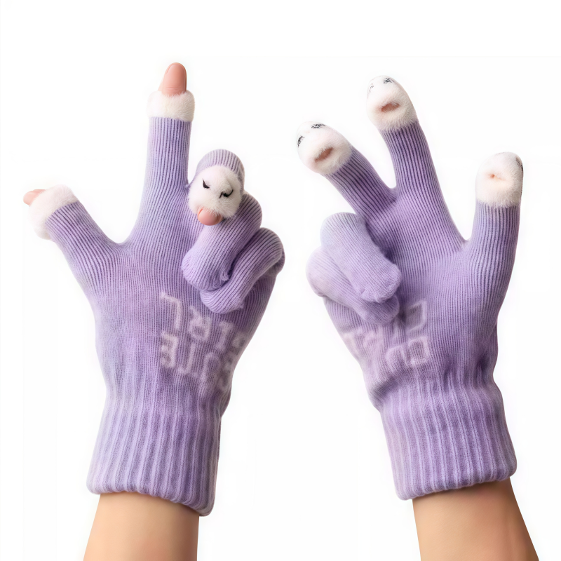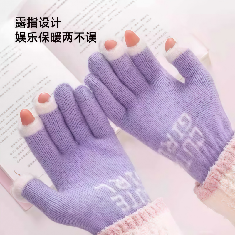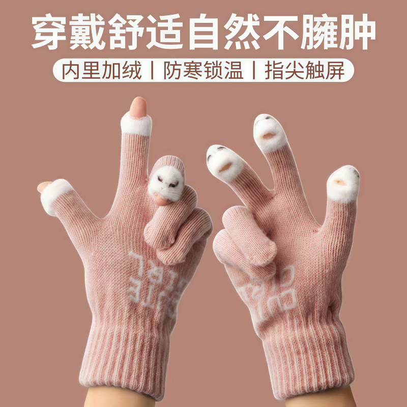 可爱毛绒针织五指手套女士冬季保暖加厚学生触屏冬天防寒露指打字
