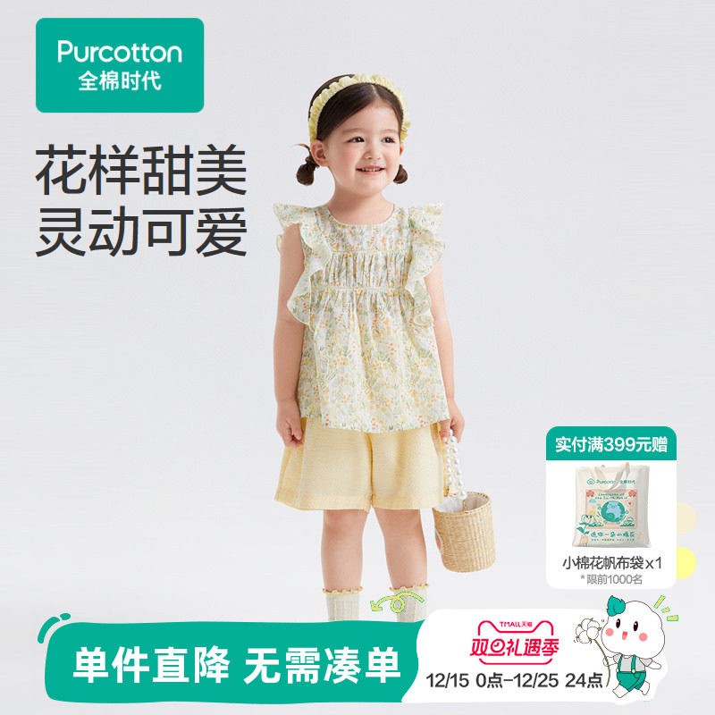 全棉时代女童衬衫短袖夏装新款100S花边袖儿童碎花衬衣套头衫