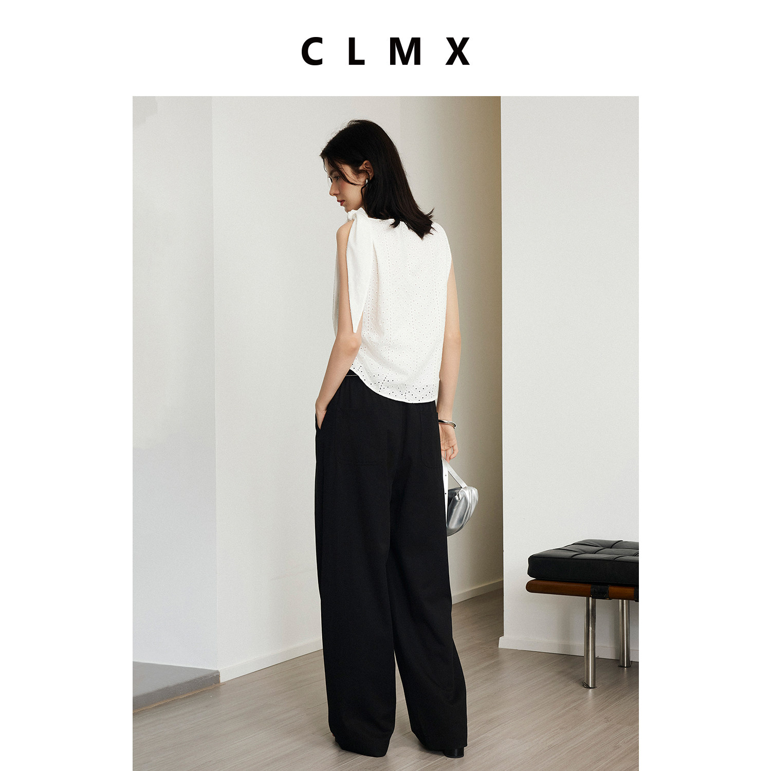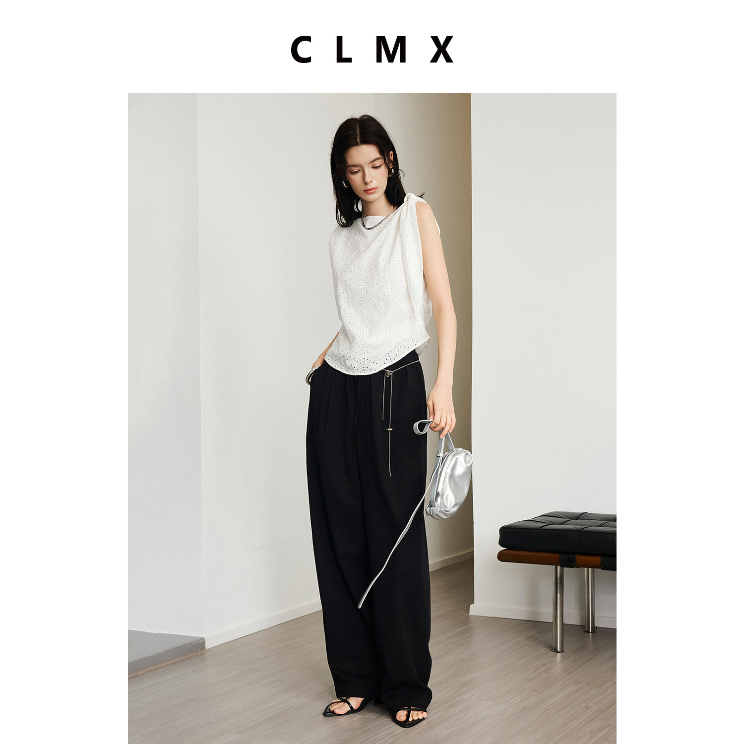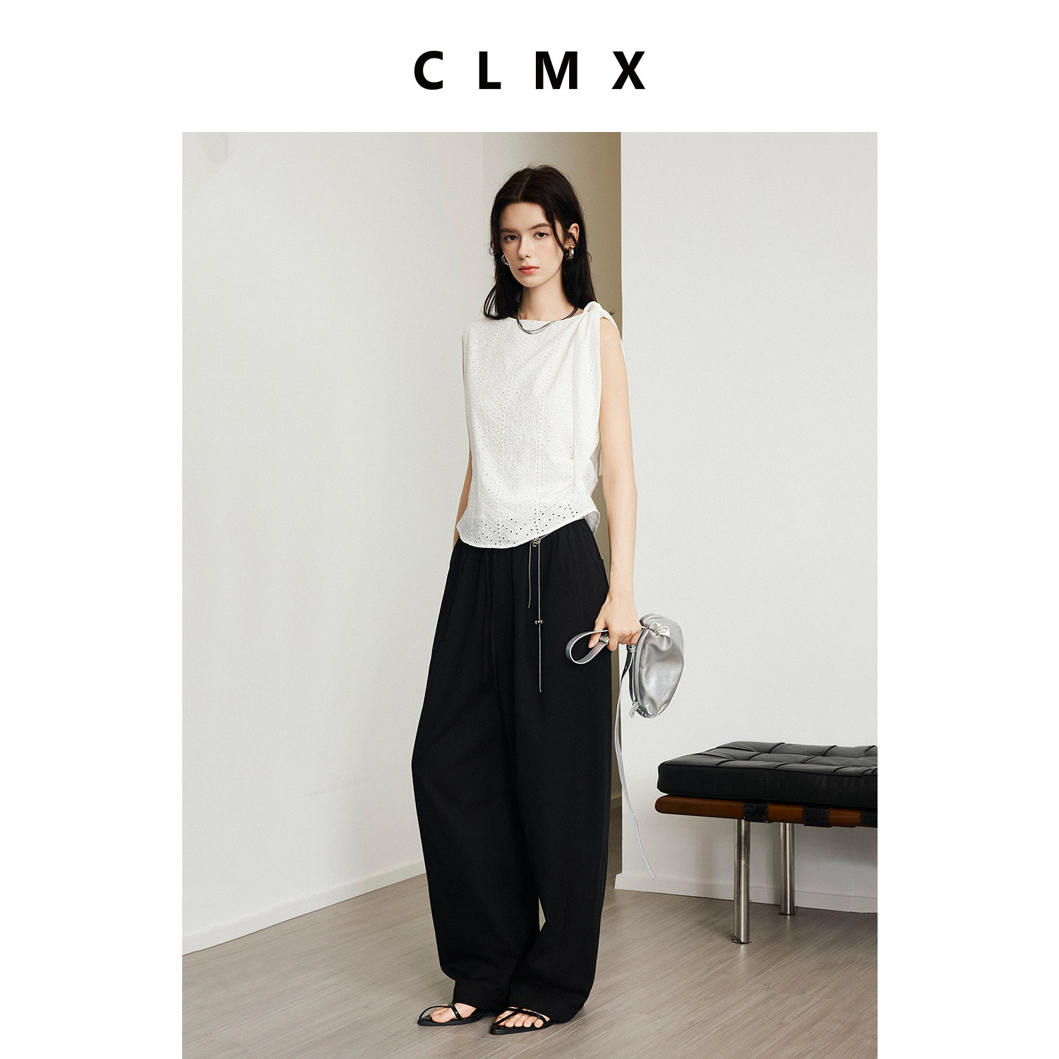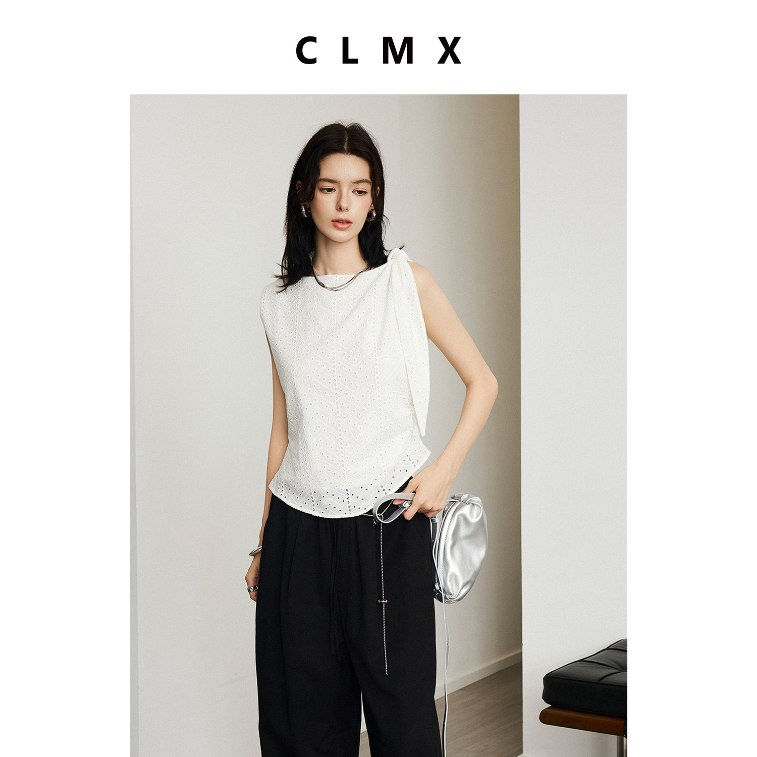 CLMX简约纯色背心透气100%棉绣花镂空面料侧褶系带上衣