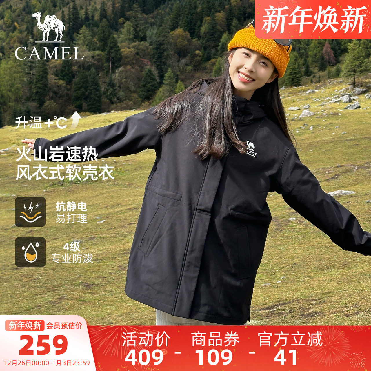 骆驼户外软壳衣外套男秋冬加绒加厚防风防水运动夹克连帽登山服女