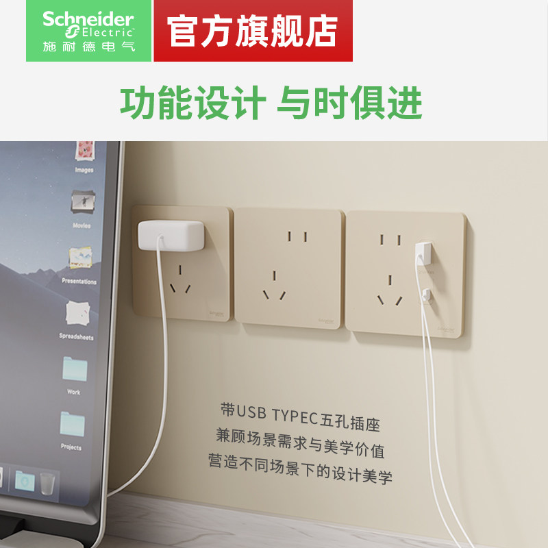 施耐德旗舰店超薄开关插座奶油风哑光面板五孔暗装皓隽摩卡棕