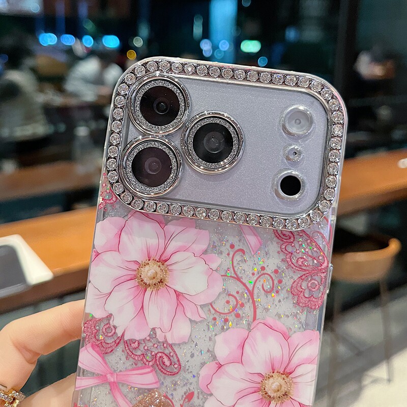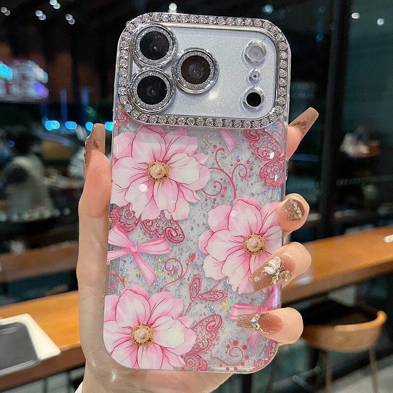 适用苹果系列iPhone17新款手机壳14pro/15promax时尚感蕾丝蓝色花13pro/16promax全包满钻精孔镜框女款保护套