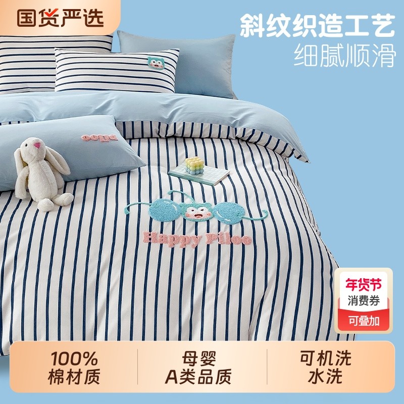 无印良品全棉四件套学生宿舍纯棉卡通儿童被套床单三件套床上用品