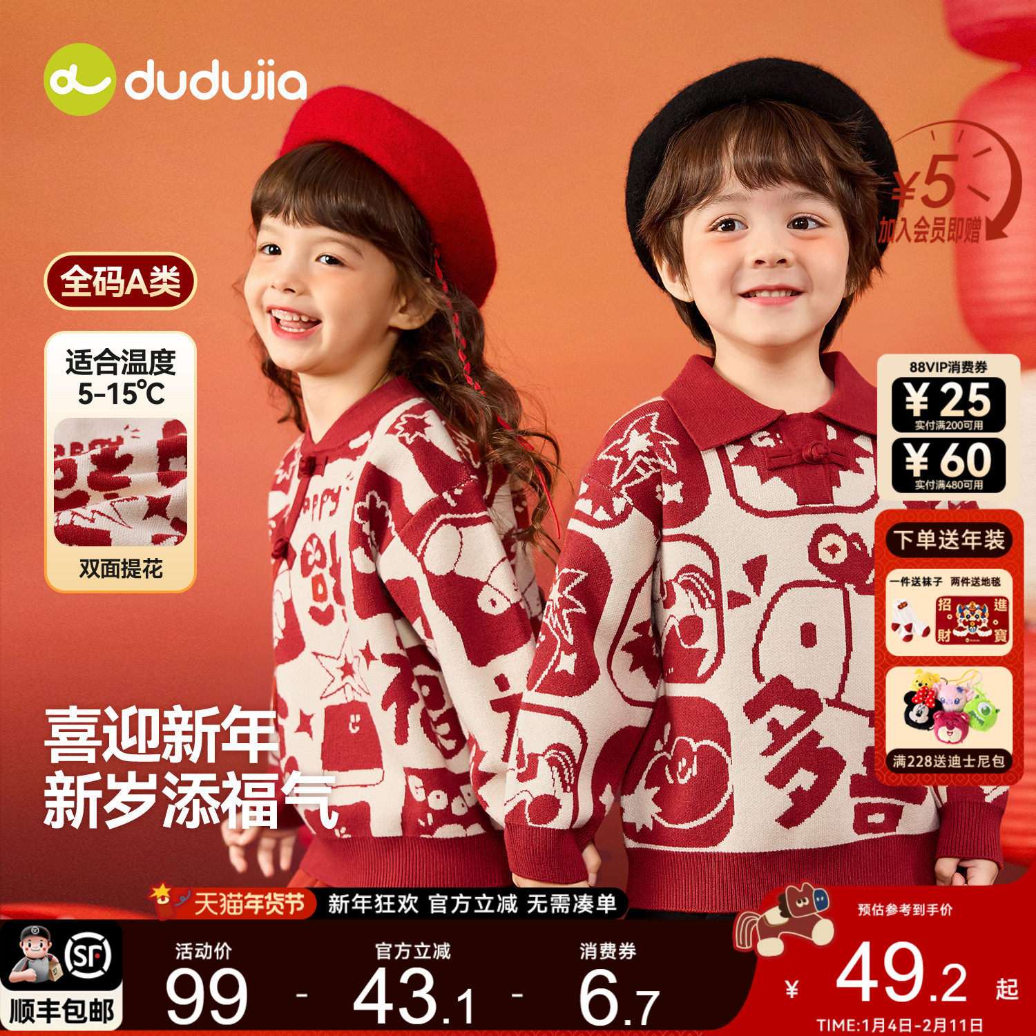 dudujia儿童毛衣红色男童上衣女童拜年服宝宝周岁礼服女宝衣服a类
