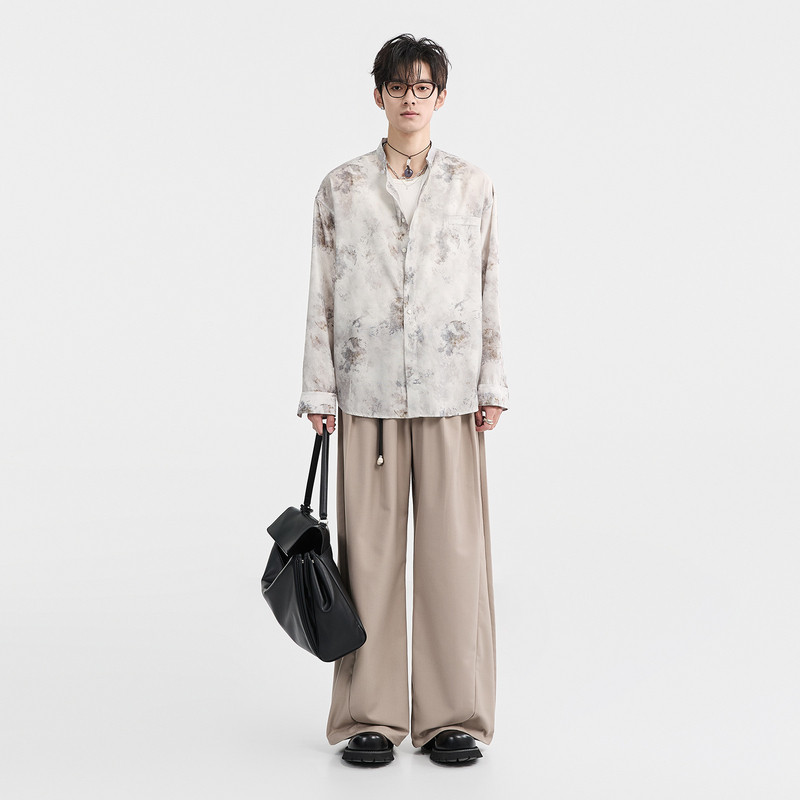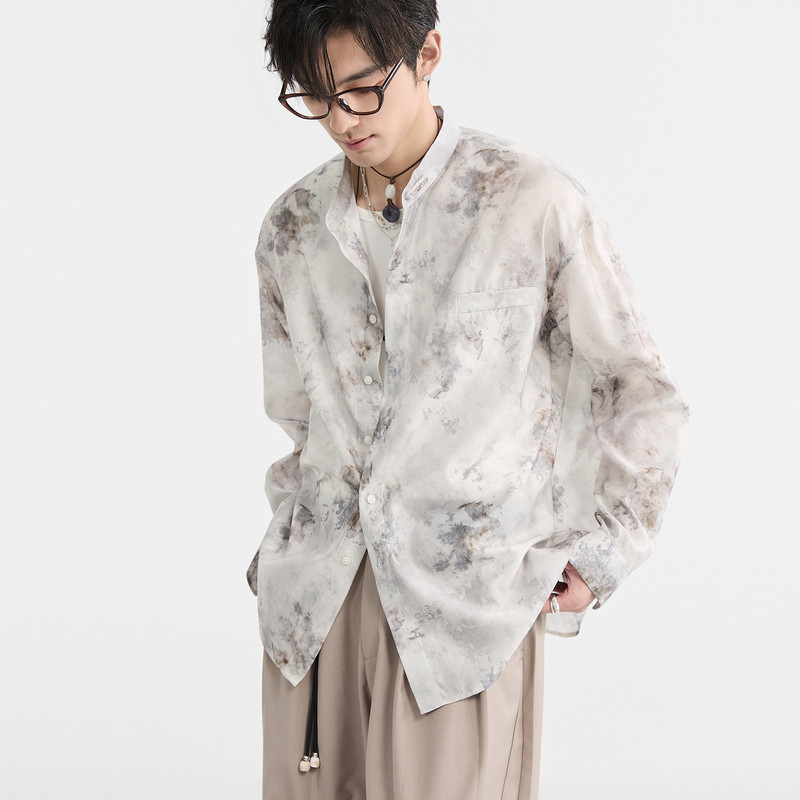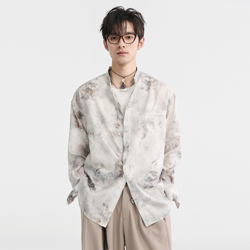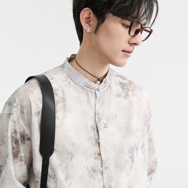 [水墨画国风]伯爵卓尔奥莱店春季新中式立领男士长袖衬衫宽松上衣