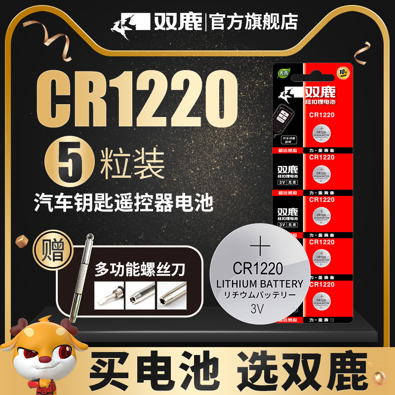 双鹿纽扣电池CR1220 3V锂电子适用于起亚悦达卡西欧dw圆形手表电子秤单反适用千里马汽车钥匙遥控器电池5粒