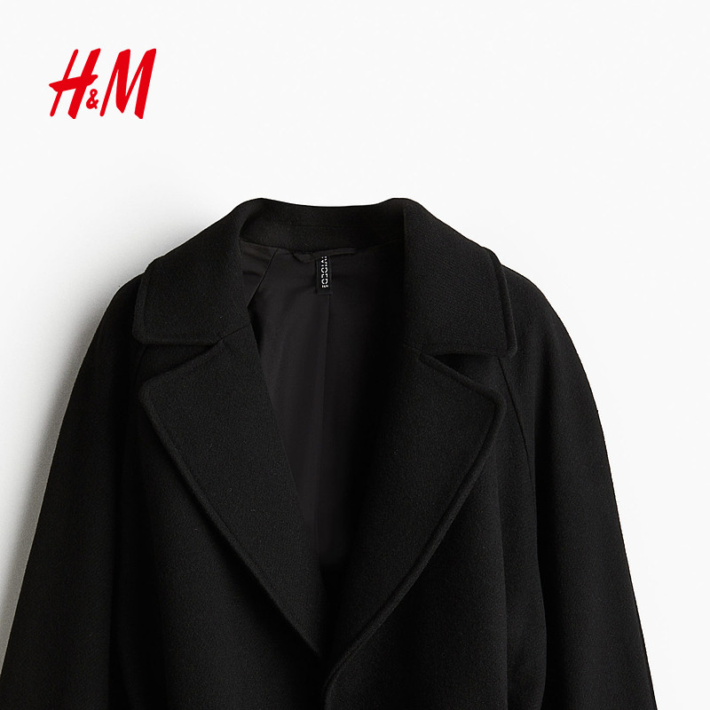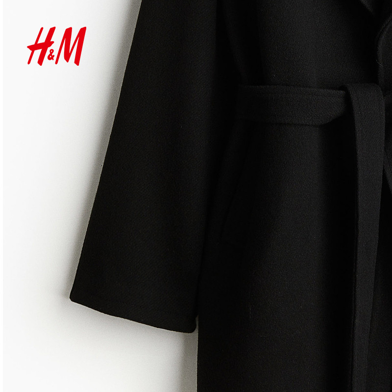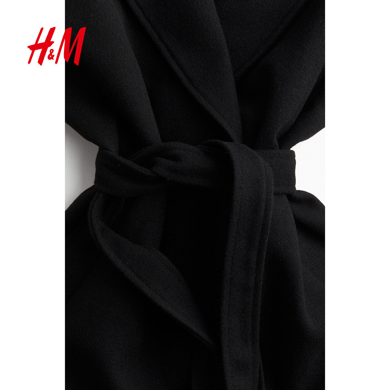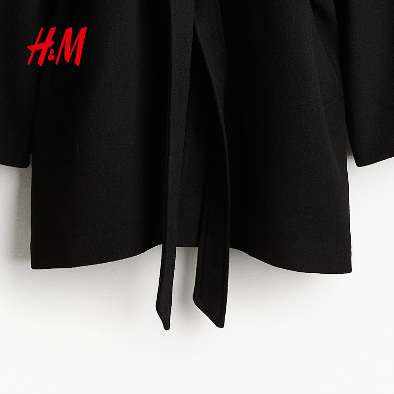 HM女装毛呢外套冬季宽松有领腰部系带毛毡短大衣1228995